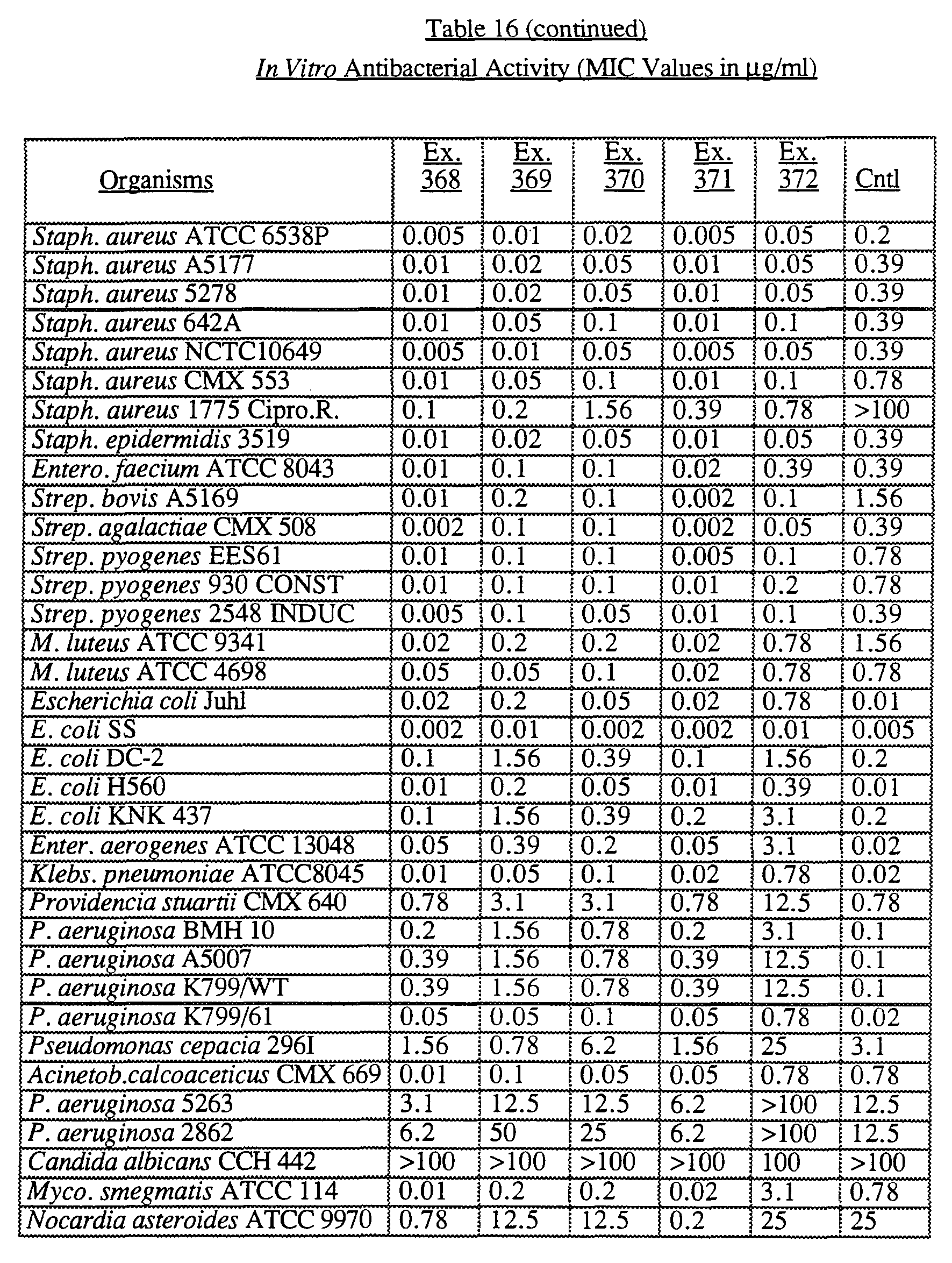 The in vitro antibacterial activity of the compounds of the present invention was demonstrated as follows: Minimum inhibitory concentrations (MICs) were determined by the agar dilution method, in which twelve petri dishes were prepared, each containing successive aqueous 2-fold dilutions of the test compounds mixed with 10 mL of sterilized Brain Heart Infusion (BHI) agar. Each plate was inoculated with 1: 100 (or 1:10 for slow-growing strains, primarily Micrococcus and Streptococcus) dilutions of up to 32 different microorganisms, using a Steers replicator block calibrated to deliver approximately 104 colony forming units (CFUs). The inoculated plates were incubated at from about 35°C to about 37°C for