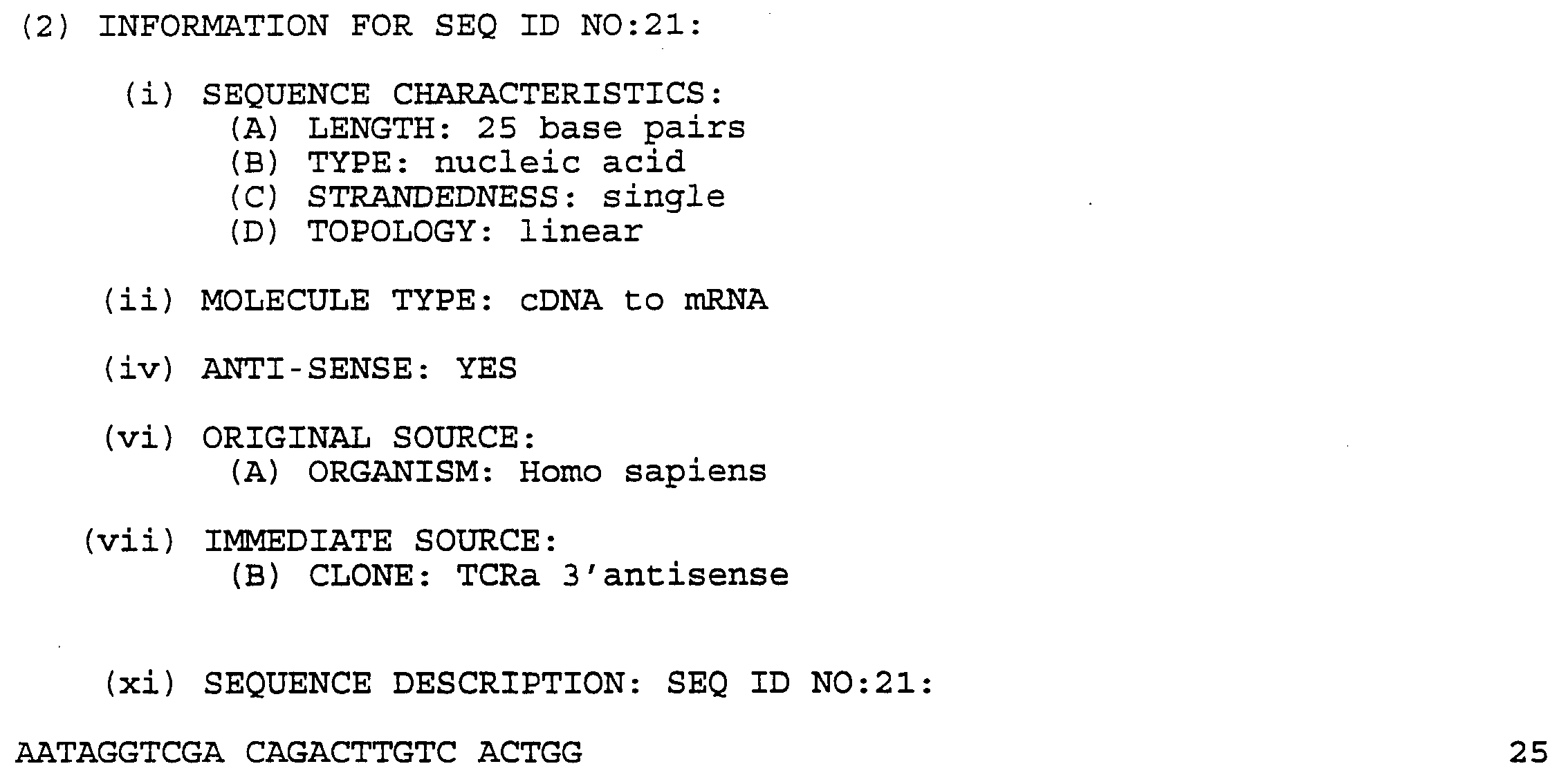 TCR a rearrangements were analyzed using PCR and a panel of Vα specific primers from a TCR α constant region primer, (J. R. Oksenberg et al., Nature 345: 344 (1990)), except primers for the Vα2 subfamily and for the TCR α. chain constant region sequence. The sense oligonucleotide primer for Vα2, 5ΑGGTCGACGAATGATGAAATCCTTGAGAG-3' (seq. I.D. No. 19), is located at the 5' leader of Vα2 coding sequence and contains a Sal I site inside for further subcloning. The 3' antisense oligonucleotide complementary to TCR α constant region sequence is 5'-AATAGGTCGACAGACTTGTCACTGG-3' (seq. I.D. No, 20) in which two nucleotides have been changed to create a Sal I site for future subcloning purpose.