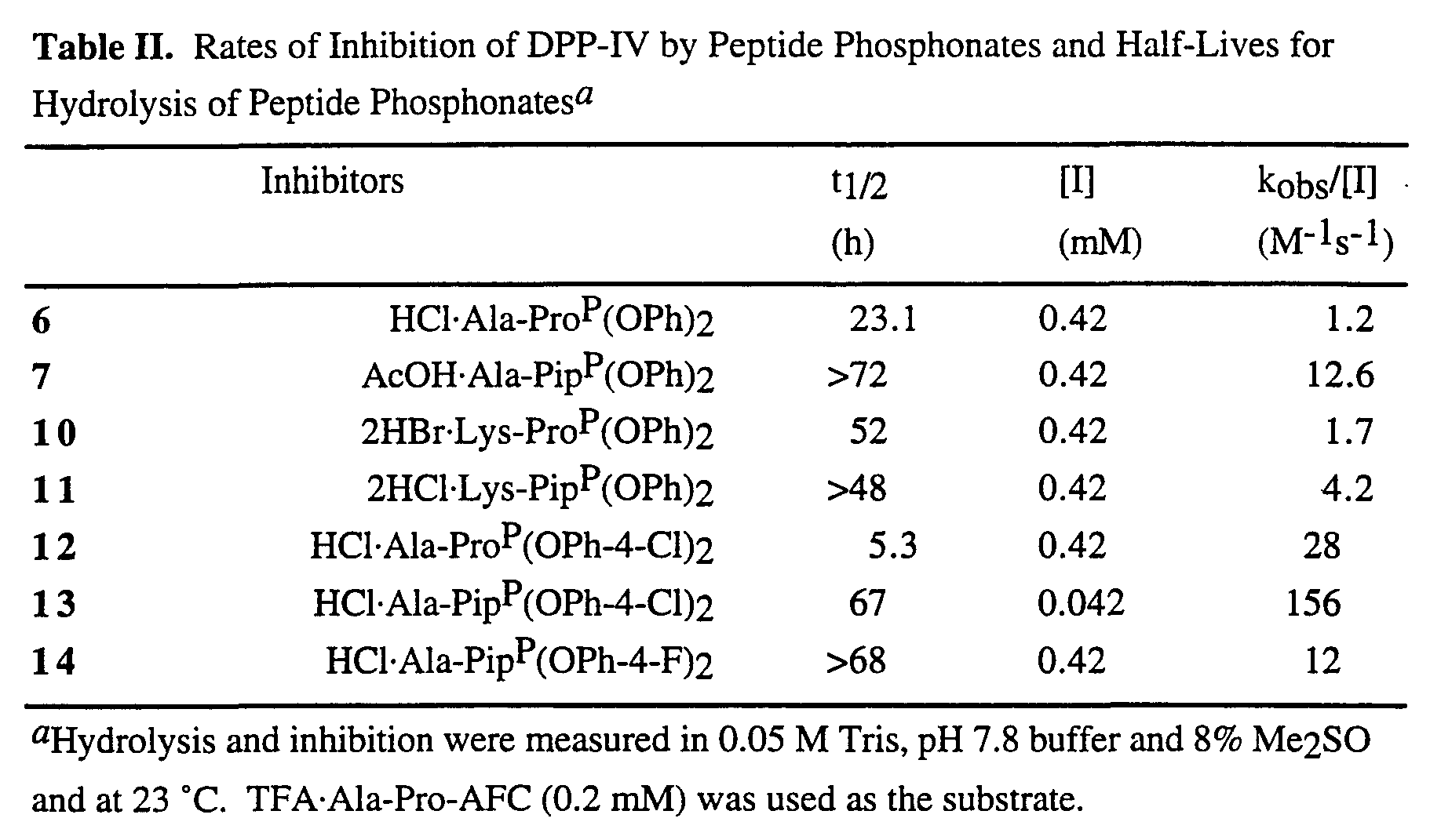 - Peptidyl derivatives of aryl diesters of ⁇ -aminoalkylphosphonic acids have be found to be excellent inhibitors of several serine proteases including bovine thrombin, human factor XIIa, human plasma kallikrein, bovine trypsin, rat skin tryptase, human leukocyte elastase, porcine pancreatic elastase, bovine chymotrypsin, human leukocyte cathepsin G, DPP-IV, and rat mast cell protease II.