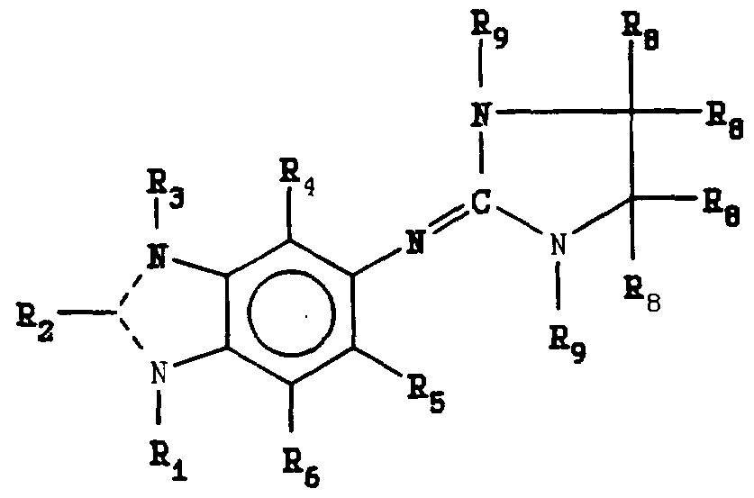 wherein each of Rx, R2, R3 and R9 is independently H; straight chain or branched, substituted or unsubstituted Cx-C, alkyl, C2-C7 alkenyl or alkynyl; C3-C7 cycloalkyl or cycloalkenyl; acyl, phenyl, substituted phenyl, or heteroaryl; wherein each dashed line represents a single bond or a double bond with the proviso that if Rx is present, R3 is absent and there is a double bond between N at position 3 and C at position 2 and a single bond between C at position 2 and N at position 1 and if R3 is present, Rλ is absent and there is a double bond between N at position 1 and C at position 2 and a single bond between C at position 2 and N at position 3; wherein each of R4, R5 and R6 is independently H, F, Cl, Br, I; straight chain or branched, substituted or unsubstituted Ci-C, alkyl, C2-C7 alkenyl or alkynyl; C3-C7 cycloalkyl or cycloalkenyl; phenyl, substituted phenyl, heteroaryl, -OH, -OR7, -CN, -COR7, -C02R7, -CON(R7)2, -OCOR7, -SR7, -N(R7)2, -NR7COR7, -(CH2)nOR7, - (CH2)nN(R7)2, - (CH2)nNR7COR7, wherein n is an integer from 1 to 4; and wherein each of R7 and R8 is independently H; straight chain or branched, substituted or unsubstituted C^ , alkyl, C2-C7 alkenyl or alkynyl; phenyl or substituted phenyl.