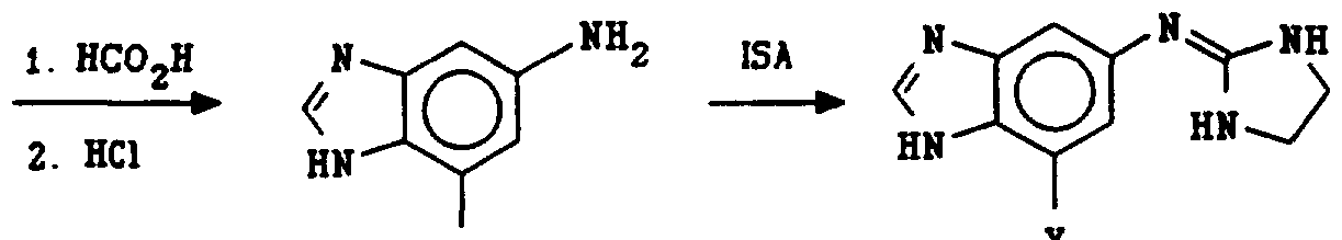 The compounds herein have been prepared using synthetic sequences shown in Schemes 1-4. C-4 halogen substituted 5-aminobenzimidazoles were obtained from commercially available 5-nitrobenzimidazole by the sequence of hydrogenation and halogenation. C-4 alkyl substituted analogs were prepared in a similar reaction sequence in which alkyl group was incorporated using a Grignard reaction (Scheme 1) . Reaction of 5-aminobenzimidazole with 2-imidazoline-2-sulfonic acid (ISA) which was obtained from 2-imidazolinethione (Gluchowski, C. U.S Patent 5,130,441) provides access to 2-aminoimidazolines in high yield (45 - 95%) . C-2 substituted 5-nitrobenzimidazoles were prepared by condensation of 4-nitro-l,2-phenylenediamine with corresponding acids (Scheme 2) . C-2 substituted 5-nitrobenzimidazoles were subjected to the same reaction sequence as Scheme 1 to provide the desired final product. Reaction of alkyl halides with 5-nitrobenzimidazole in the presence of NaH provided both N-l and N-3 substituted benzimidazoles