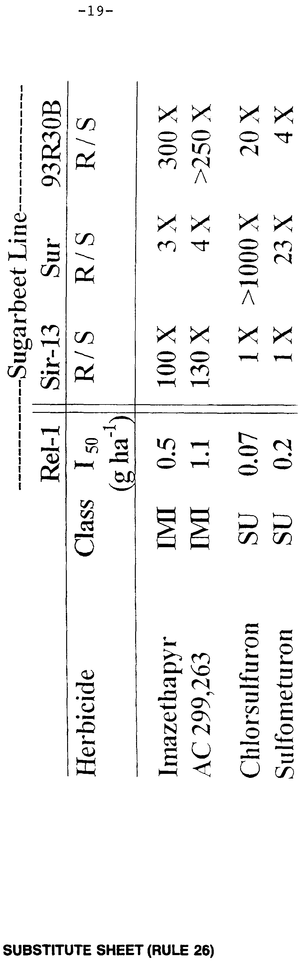 - 93R30B showed a 3600 fold level of resistance to imazethapyr, a 10,000 fold resistance to chlorsulfuron and showed a 60 fold cross resistance to the triazolopyrimidine sulfonanilide herbicide, flumetsulam as shown in Table 1.
