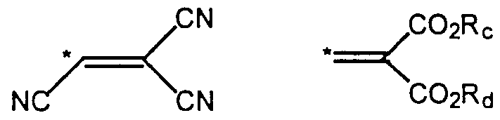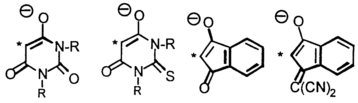 - R is as defined below in Note 3B, and X(O) indicates that the element oxygen is double bonded to the element X and * indicates the point of attachment to the ⁇ -conjugated bridge.