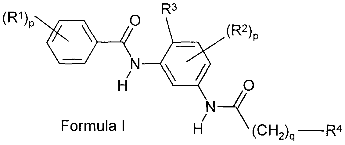 - R 4 is aryl or cycloalkyl wherein R 4 is optionally substituted with upto 3 substituents having any value defined for R 1 ; or a pharmaceutically-acceptable salt or in vivo hydrolysable ester thereof and a pharmaceutically-acceptable carrier with the proviso that N-[5-(3-cyclohexyl- propionylamino)-2-methylphenyl]-4-hydroxybenzamide, N-[5-(3- cyclopentylpropionylamino)-2-methylphenyl]-4-acetoxybenzamide, N-[5-(3- phenylpropionylamino)-2-methylphenyl]-4-acetoxybenzamide,