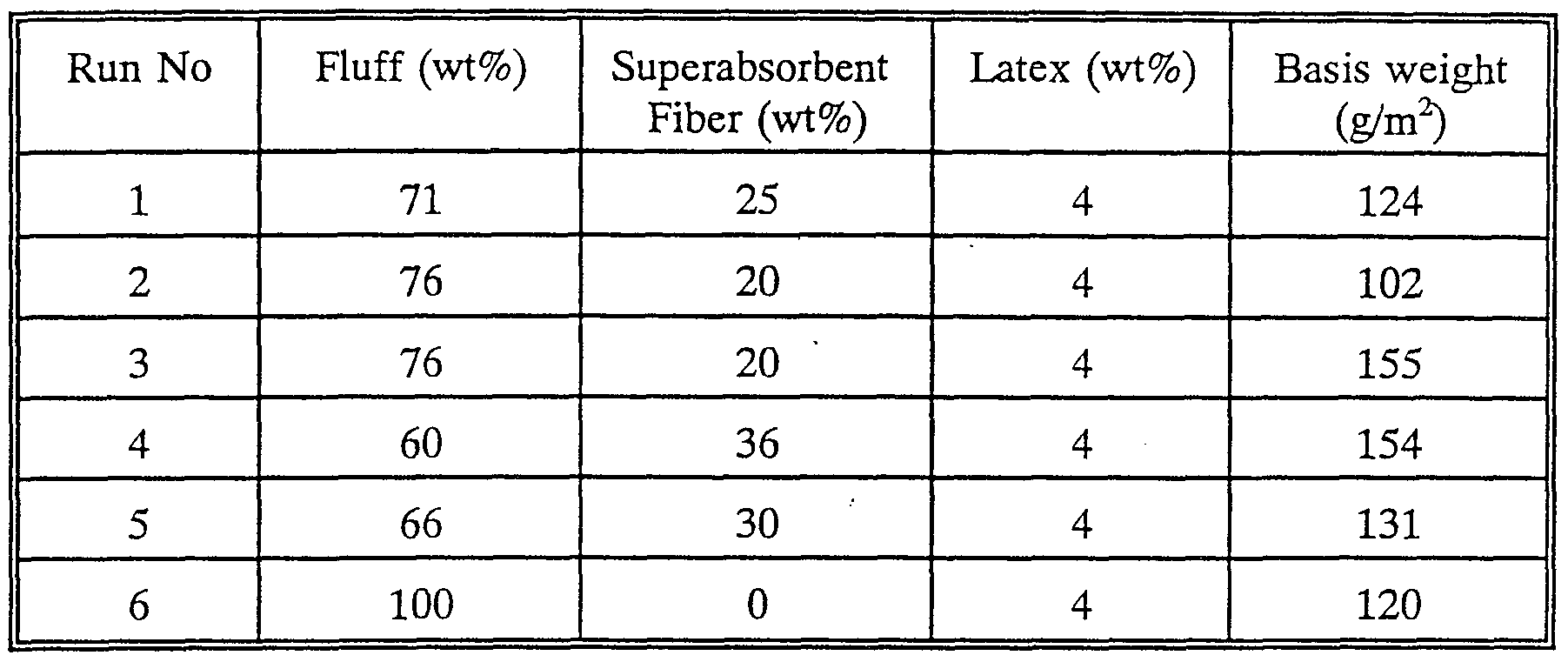 - the particles of the superabsorbent are preferably added after the fibers have been wetted by the binder such that the binder does not coat the particles and thereby interfere with their absorbency.