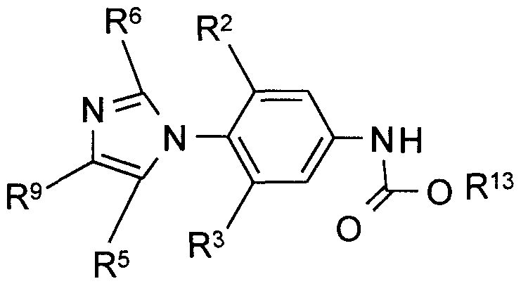 The coupling reaction between a compound of the formula (III) and a compound of the formula Het- Y-L1 is conveniently performed in an inert solvent such as acetonitrile, dichloromethane, N,N-dimethylformamide or N,N-dimethylacetamide, at a temperature in the range 0°C to the reflux temperature of the solvent, preferably in the range ambient to 70°C. The precise reaction conditions and the nature of the starting materials will depend upon the nature of the -X-Y- bond that is to be formed between the imidazole ring in the compound of formula (III) and the Het. group in R4 or R9. The skilled organic chemist will be able to select suitable starting materials and conditions to produce the range of -X-Y- bonds detailed in this specification, and non-limiting representative examples are provided in the Examples contained herein. Suitable values for the leaving groups L1 and L2 are provided below. For example :- Methylthio linkages (X is -CH2-, Y is -S-) may be prepared by the reaction of an