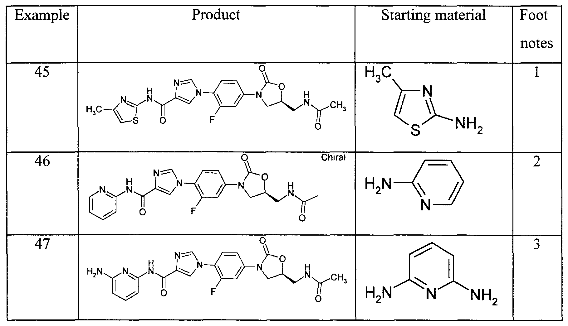 The intermediate N-[(5S)-3-(3-fluoro-4-(4-thiocarbamidoimidazol- 1 -yl)phenyl)-2- oxooxazolidin-5-ylmethyl]acetamide was prepared as follows :- N-[(5S)-3-(3-Fluoro-4-(4-cyanoimidazol-l-yl)phenyl)-2-oxooxazolidin-5-ylmethyl]acetamide (WO97/31917; 686 mg, 2 mM) was dissolved in pyridine (30 ml), and triethylamine (1 ml, 7.2 mM) added. The mixture was stirred under a condenser cooled to -80°, and hydrogen sulfide gas introduced through a bubbler, until an excess was present, as judged by the appearance of liquid drops on the condenser. The mixture was stirred for 18 hours, the coolant in the condenser being allowed to evaporate. Excess hydrogen sulfide was removed under mild vacuum, and the solution diluted with diethyl ether (100 ml). The precipitate was