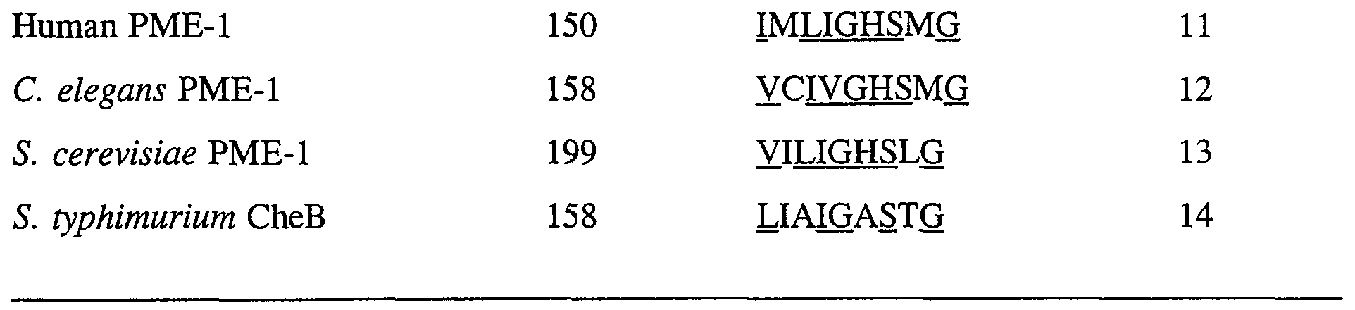 - the PME-1 coding sequence and methods of the present invention include the homologous coding sequences in organisms other than humans and mice. Methods can be employed to isolate the corresponding coding sequences (for example, from cDNA) from other organisms, including but not limited to other mammals, avian species, Saccharomyces and Caenorhabditis elegans useful in the methods of this invention using the sequences disclosed herein and experimental techniques well known to the art.