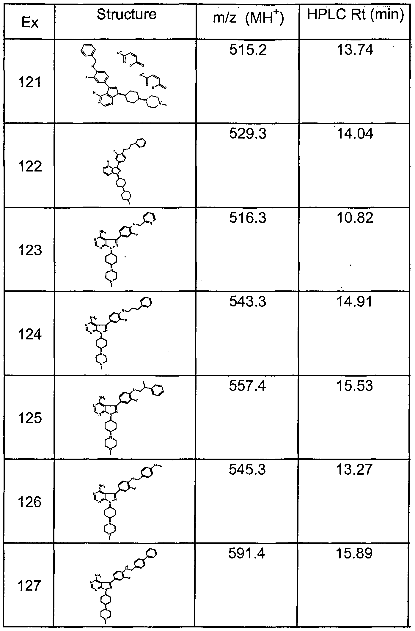 RP-ΗPLC (Delta Pak C 18, 5μm, 300A, 15 cm; 5%-85% acetonitrile - O.IM ammonium acetate over 10 min, lmL/min) R, 11.5 min. MS: MΗ+ 618 e) rα«_s Nl-{4-[4-amino-l-(4-piperidyl)-lH-pyrazolo[3,4-c |pyrimidin-3-yl]-2- methoxyphenyl} -( 1 S,2S)I( 1 /?,2/_)-2-phenyl- 1 -cyclopropanecarboxamide maleate The mixture of trans benzyl 4-[4-amino-3-(3-methoxy-4-{[(2- phenylcyclopropyl)carbonyl]amino}phenyl)-lH-pyrazolo[3,4-cT|pyrimidin-l-yl]-l- piperidinecarboxylate (3.4 g, 0.0055 mol) and 20 % palladium hydroxide on carbon (0.4 g) in ethanol (150 mL) was stirred under atmosphere of hydrogen at room temperature for 18 hours. The mixture was filtered and solvents were removed. To the residue 20 % palladium hydroxide on carbon (0.4 g), acetic acid (0.25 mL) in ethanol (60 mL) and ethyl acetate (40 mL) were added. The mixture was stiπed under atmosphere of hydrogen at room temperature for additional 18 hours. The mixture was filtered and the solvents were removed under reduced pressure. The residue was purified by flash column chromatography on silica using 25 % - 50 % methanol / dichloromethane to give trans Nl- {4- [4-amino- 1 -(4-piperidyl)- 1H- pyrazolo[3,4-f/]pyrimidin-3-yl]-2-methoxyphenyl}-(lS,2S)/(li?,2/_)-2-ρhenyl-l- cyclopropanecarboxamide (1.36 g, 0.0028 mol). Trans Nl - {4-[4-amino- 1 -(4- piperidyl)-lH-pyrazolo[3,4- ]pyrimidin-3-yl]-2-methoxyρhenyl}-(lS,2S)/(li_,2/-)-2- phenyl-1 -cyclopropanecarboxamide (0.05 g, 0.000104 mol) in ethyl acetate (5 mL) was heated to 40 CC. Maleic acid (0.00133 g, 0.000114 mol) was dissolved in warm ethyl acetate before added into the mixture. The mixture was stirred at 40 °C for 10 minutes then cooled to room temperature. The white precipitates were filtered to give trans Nl - {4-[4-amino- 1 -(4-piperidyl)-lH-pyrazolo[3,4-./]pyrimidin-3-yl]-2- methoxyphenyl } -( 1 S,2S)/( l/?,2/_)-2-phenyl- 1 -cyclopropanecarboxamide maleate (0.0044 g, 0.00001 mol). Η ΝMR (DMSO-./6, 400 MHz) δ 9.65 (s, IH), 8.26 (m, 2H), 7.25 (m, 7H), 6.01 (d, 2H), 5.09 (br, IH), 3.90 (s, 3H), 3.48 (m, 2H), 3.18 (m, 2H), 2.61 (br, IH), 2.37 (m,