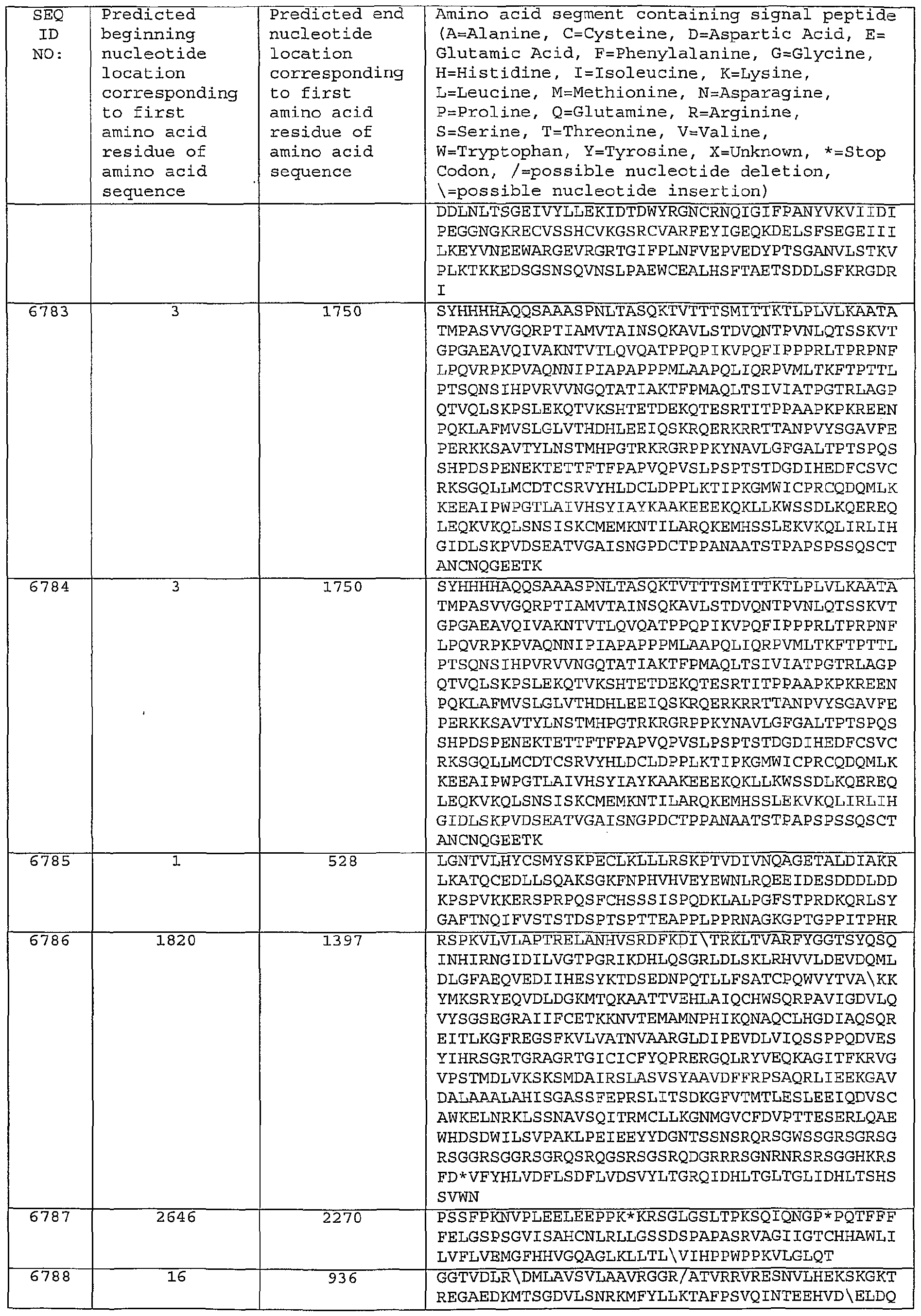 - Polypeptides of the invention also include polypeptides with biological activity that are encoded by (a) any of the polynucleotides having a nucleotide sequence set forth in SEQ ID NO: 1-1786 and 3573-5358; or (b) polynucleotides that hybridize to the complement of the polynucleotides of (a) under stringent hybridization conditions.
