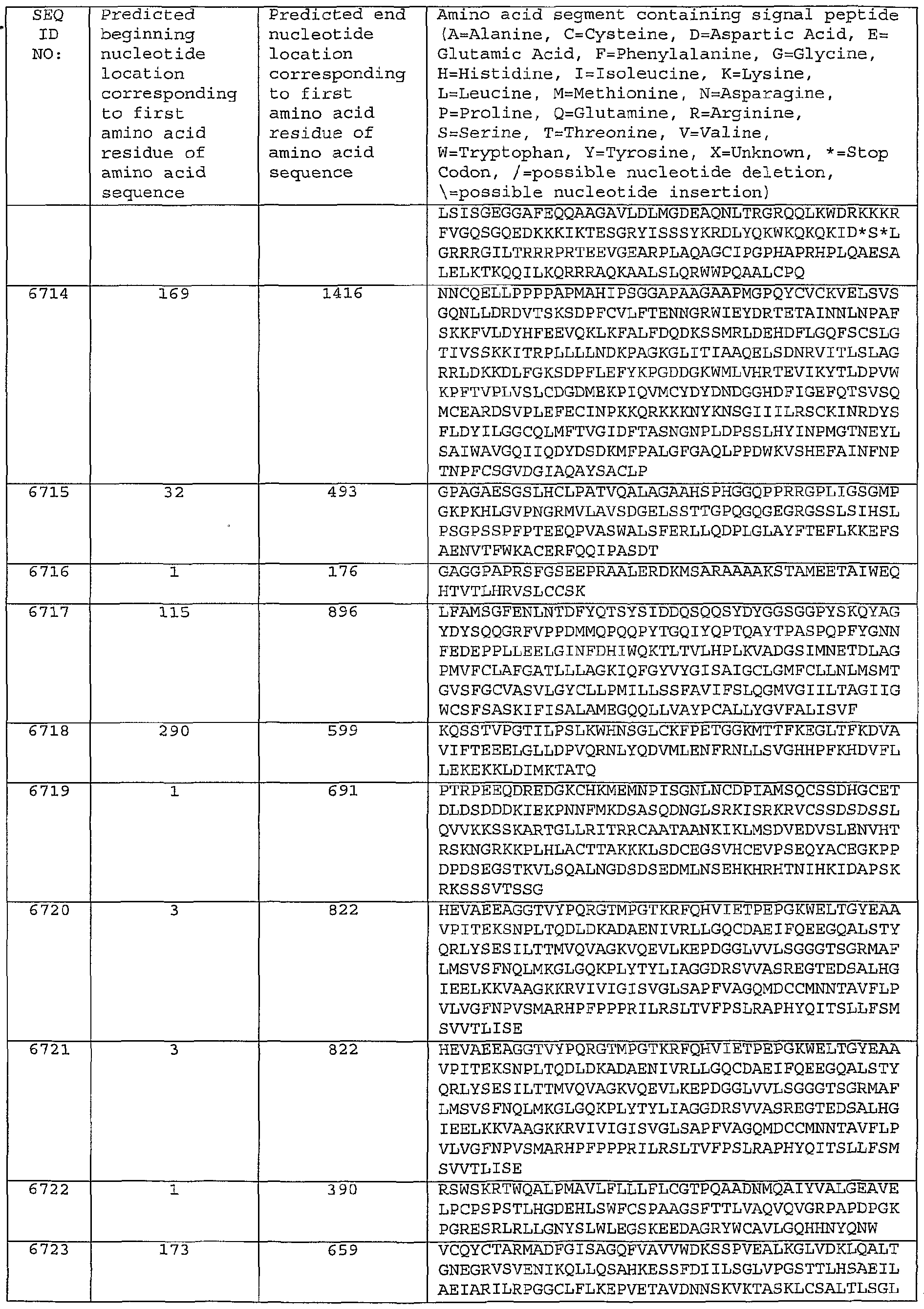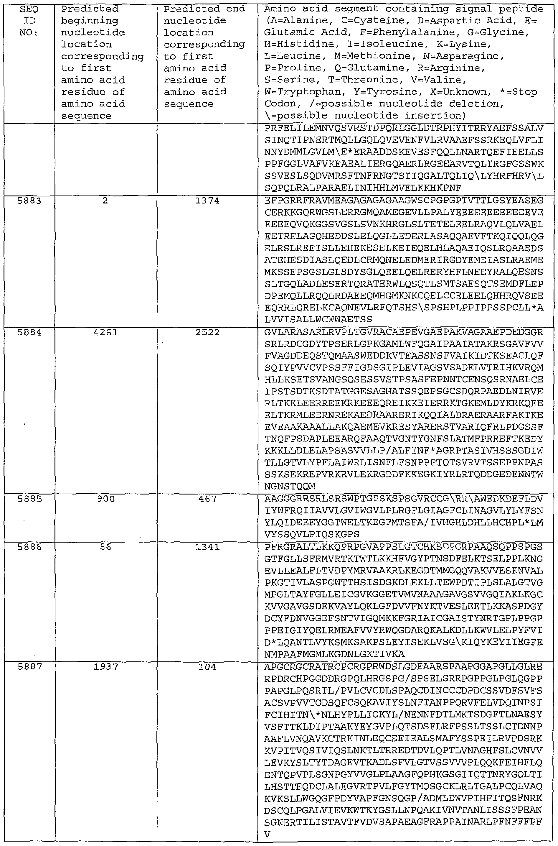 - polypeptides of the present invention and the polynucleotides encoding them are also useful for the same functions known to one of skill in the art as the polypeptides and polynucleotides to which they have homology (set forth in Table 2); for which they have a signature region (as set forth in Table 3); or for which they have homology to a gene family (as set forth in Table 4). If no homology is set forth for a sequence, then the polypeptides and polynucleotides of the present invention are useful .for a variety of applications, as described herein, including use in arrays for detection.