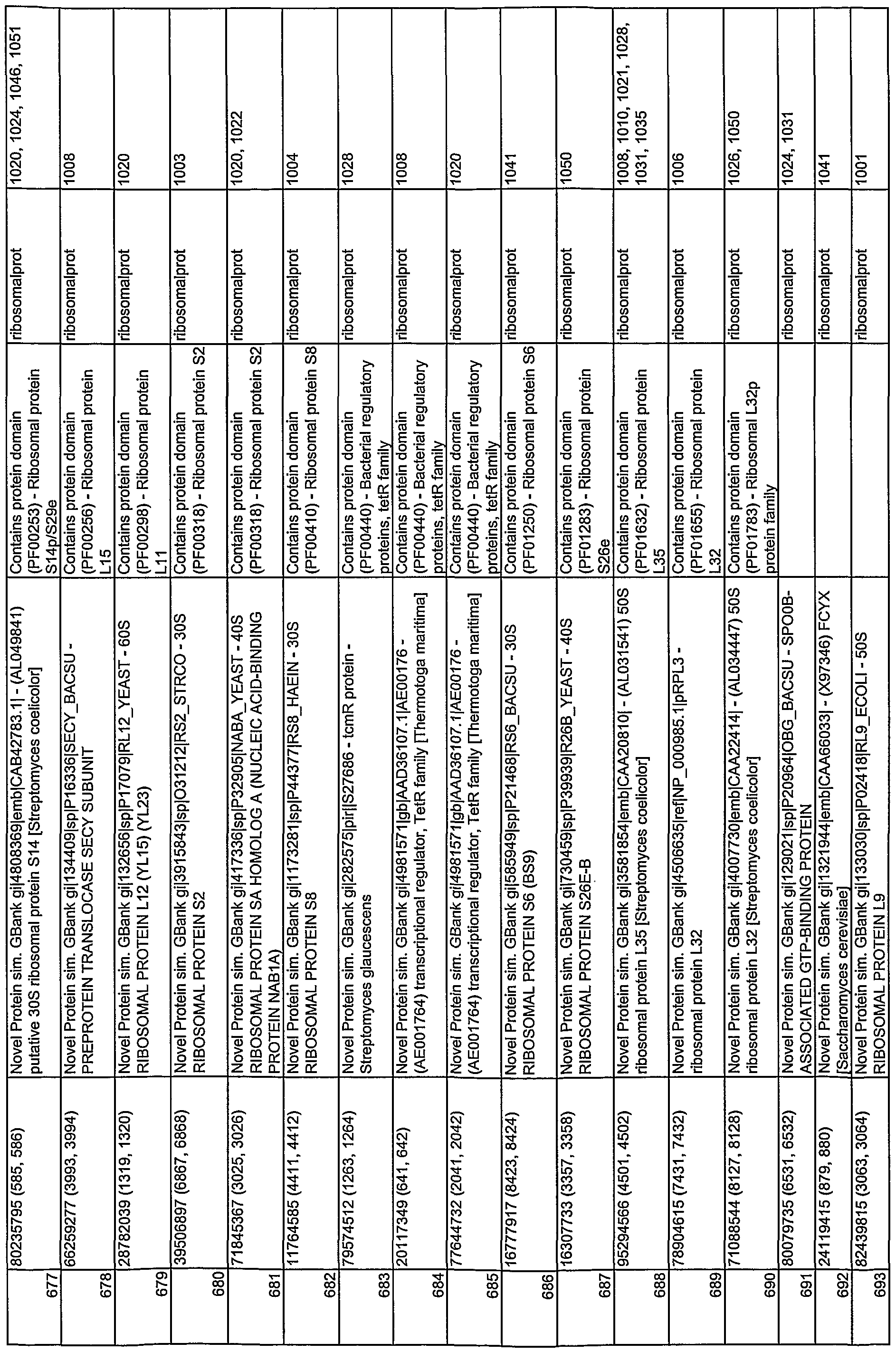 To determine similarity to previously described proteins, polypeptides encoded by ORFX DNA sequences were tested using the Framesearch Algorithm against a nonredundant version of the GenPept Database from NCBI/Genbank. DNA sequences that had a score of '90' or above (Framesearch algorithm score, Ede nan et. al. GCG Genetics) to a known protein were selected. Open reading frames were extended beyond the region of the protein matched using standard DNA translation and codon tables. Novel proteins that lacked a protein match were translated against the standard genetic codons and proteins with an ORF at least 80 amino acids and containing a Methionine start are included in the Table. Column 4 of Table 1, entitled "Protein Domain", lists previously described protein domains, designated by pfam entries, that are present in the polypeptides encoded by the ORFs, Also included in column 3 are proteins in which these domains are present. The pfam entries can be retrieved from http ://pfam. wustl.edu/. DNA sequences were translated in all six frames and tested using the Hmmer Algorithm against the Pfam Database (References to the algorithm and Pfam database can be found at http://pfam.wustl.edu). Translated DNA sequences that matched a protein domain entry in the Pfam database AND had a score of 7.5' were selected.