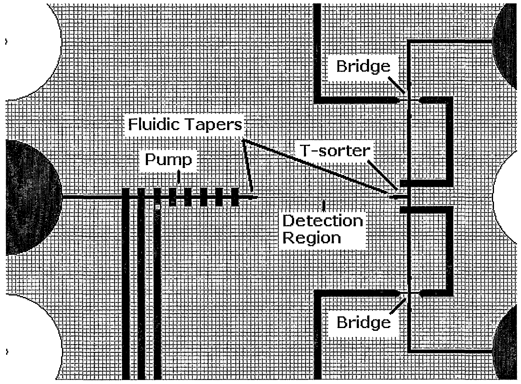 FIG. 3 is a simplified top down view of microfluidic switch of an embodiment of the present invention FIGS. 4A-4K show symbols representing microfluidic devices of an embodiment of the present invention;