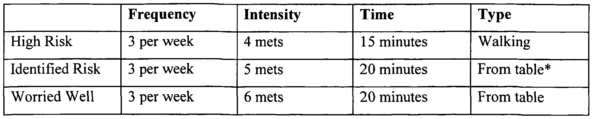 After the subject has followed the initial exercise program and provided their feedback, the next exercise program can be determined for the subject. As a basic rule, the exercise program should only be changed in two ways: to vary the type to avoid boredom to change the exercise intensity and time as the subject progresses. If the feedback shows a value of no or not much for the enjoyment of the session then the Type should be changed according to the facilities available.