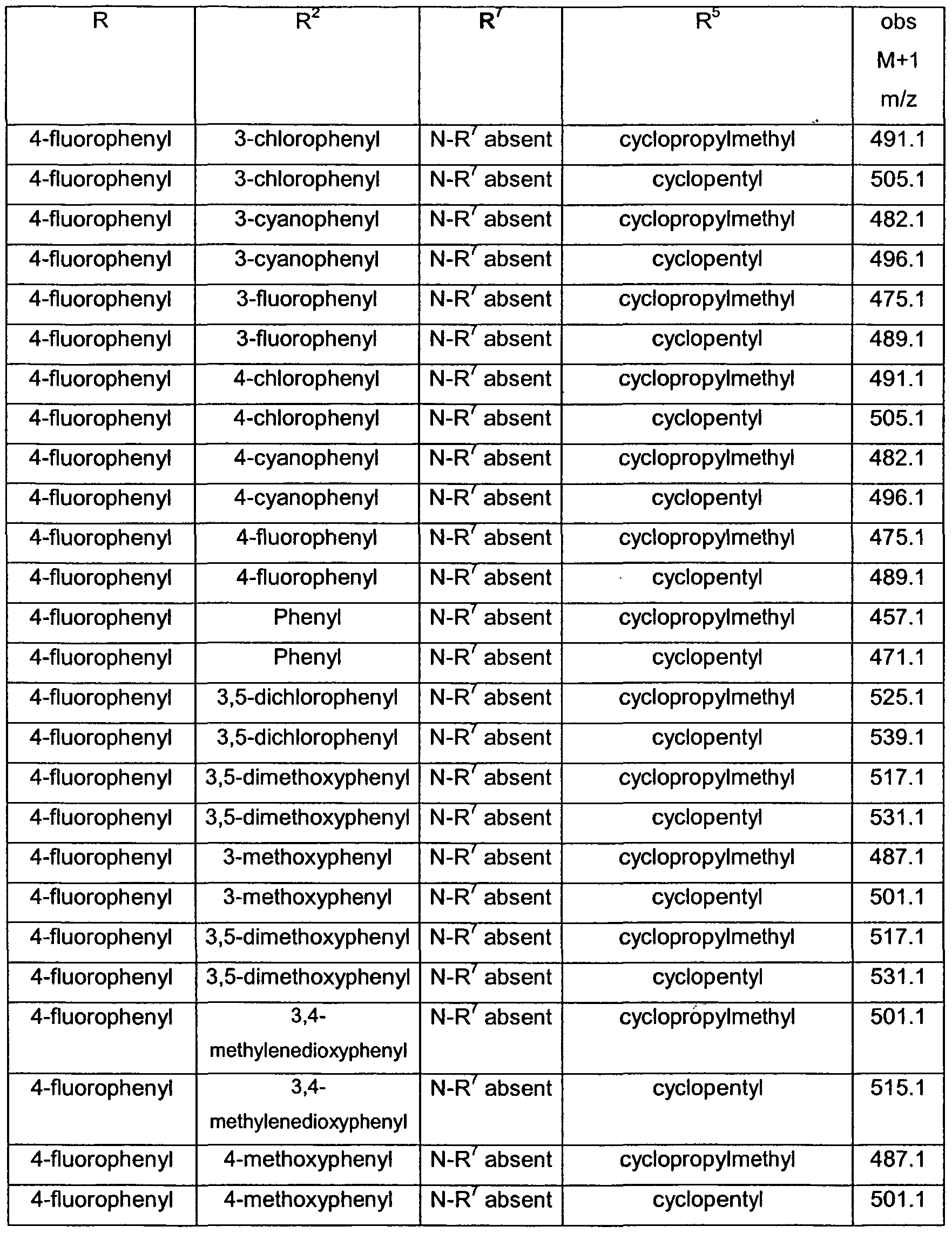 - R 4 and R 8 maybe the same or different, may number 0 to 3, each being independently selected from the group consisting of hydrogen, -(C- ⁇ -C 6 )alkyl, -(C 3 - C 7 )cycloalkyl, halo, -CN, (C ⁇ -C 6 )alkoxy,-CF 3 , -OCF 3 , -CONH 2 , -CONH(C C 6 )alkyl, - CON ⁇ CsJalkyl (C ⁇ -C 6 )alkyl, -NH 2 , -NHC( ⁇ CrC 6 )alkyl, -NHC(O)NH(C C 6 )alkyl, - NHC(0)N((C ⁇ -C 6 )alkyl)((C ⁇ -C ⁇ )alkyl) f -NHSO ⁇ d-CeJalkyl, -Sfd-Cejalkyl, -SO(C)
