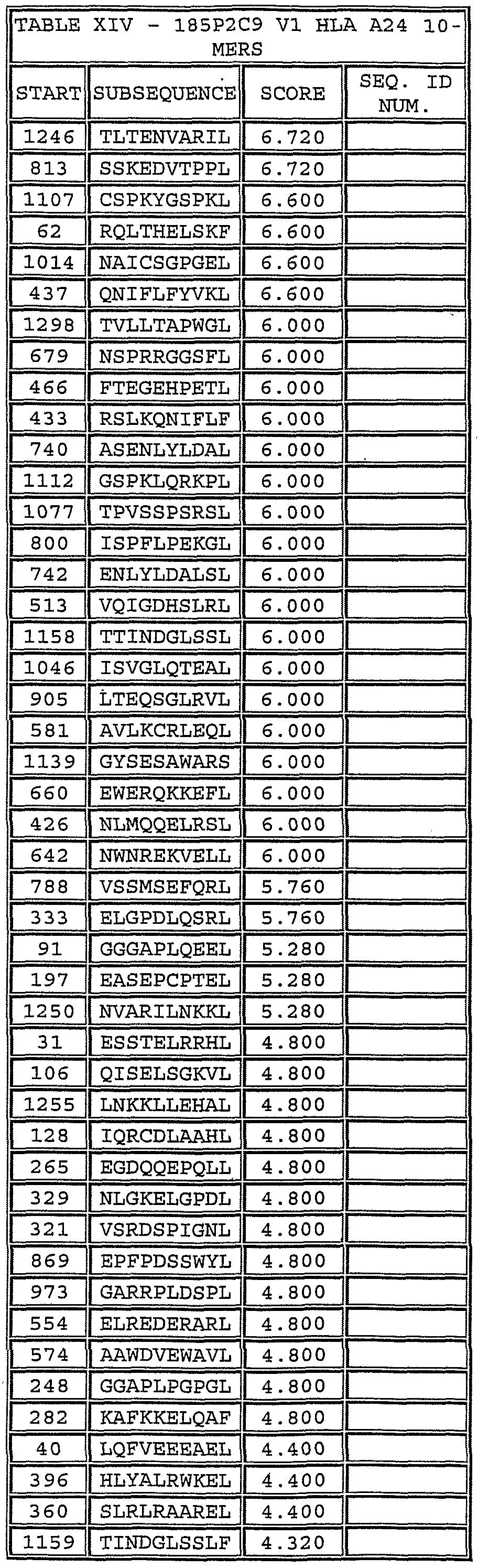 One embodiment ofthe invention comprises an HLA peptide, that occurs at least twice in Tables V-XVIII and XXIII to XXVI collectively, or an oligonucleotide that encodes the HLA peptide. Another embodiment ofthe invention comprises an HLA peptide that occurs at least twice in Tables V-XVIII, or an oligonucleotide that encodes the HLA peptide. Another embodiment ofthe invention comprises an HLA peptide that occurs at least twice in Tables XXIII to XXVI, or an oligonucleotide that encodes the HLA peptide. Another embodiment ofthe invention comprises an HLA peptide that occurs at least once in Tables V-XVIII and is embedded within at least one peptide in Tables XXIH to XXVI, or an oligonucleotide that encodes the HLA peptide.