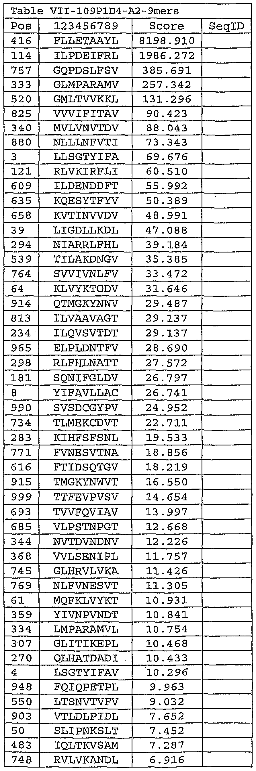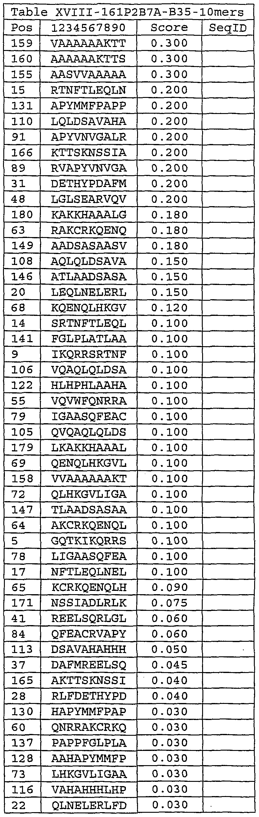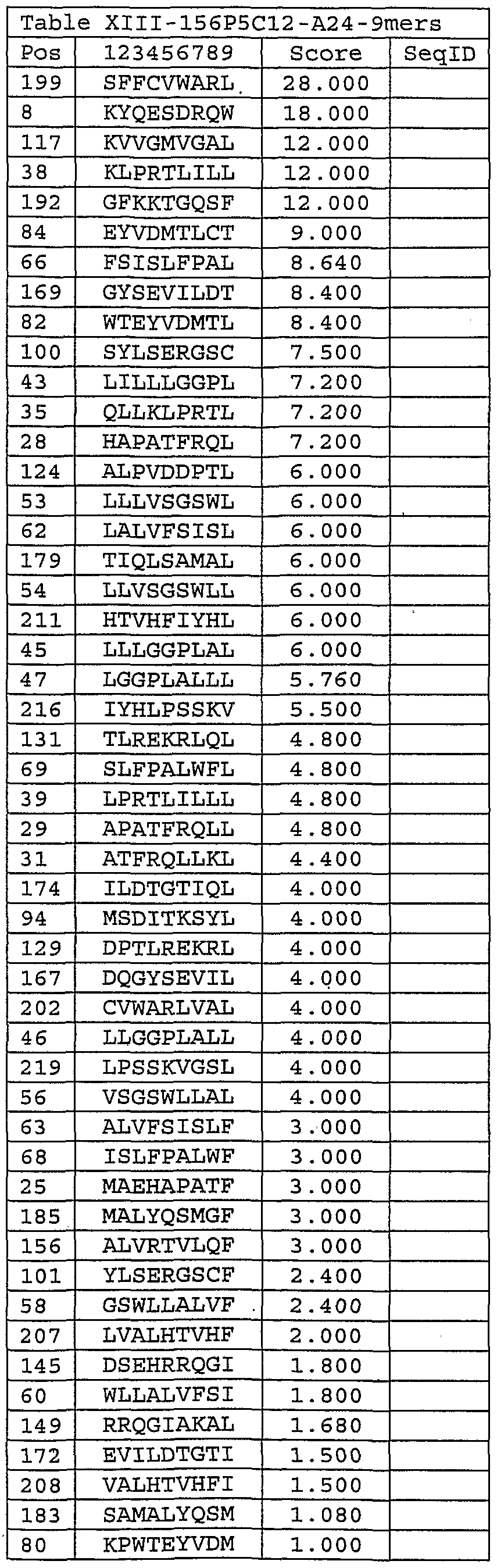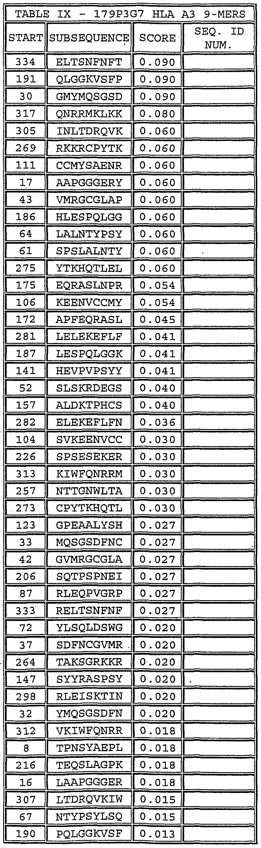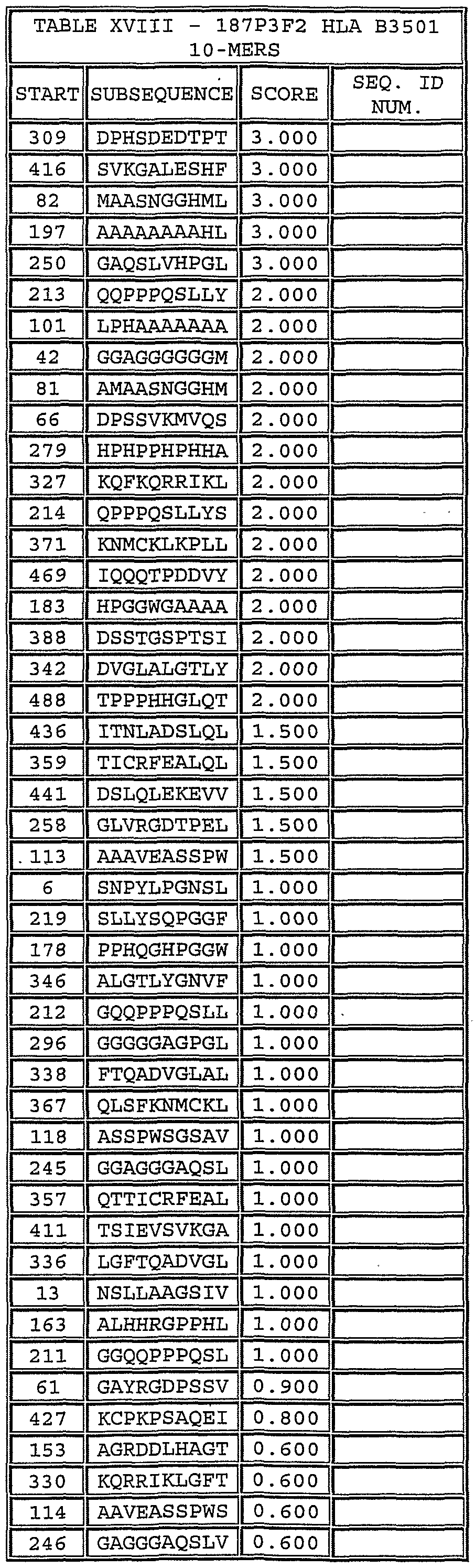 Please note, to determine the starting position of any peptide set forth in Tables V-XVIII and Tables XXIII to XXVI (collectively HLA Peptide Tables) respective to its parental protein in Figure 2 or Figure 3, reference is made to its respective protein.