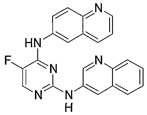 Λ/-(4-Benzylphenyl)-2-chloro-5-fluoro-4-pyrimidinamine, obtained from 5- fluoro-2,4-dichloropyrimidine and 4-benzylaniline using the method of Example 21 , (1 equiv) was treated with 6-aminoquinoline (2 equiv), and suspended in 1 N HCI. The mixture was heated at 100 °C for 7 days. Upon cooling to rt, the solution was neutralized with 2N Na