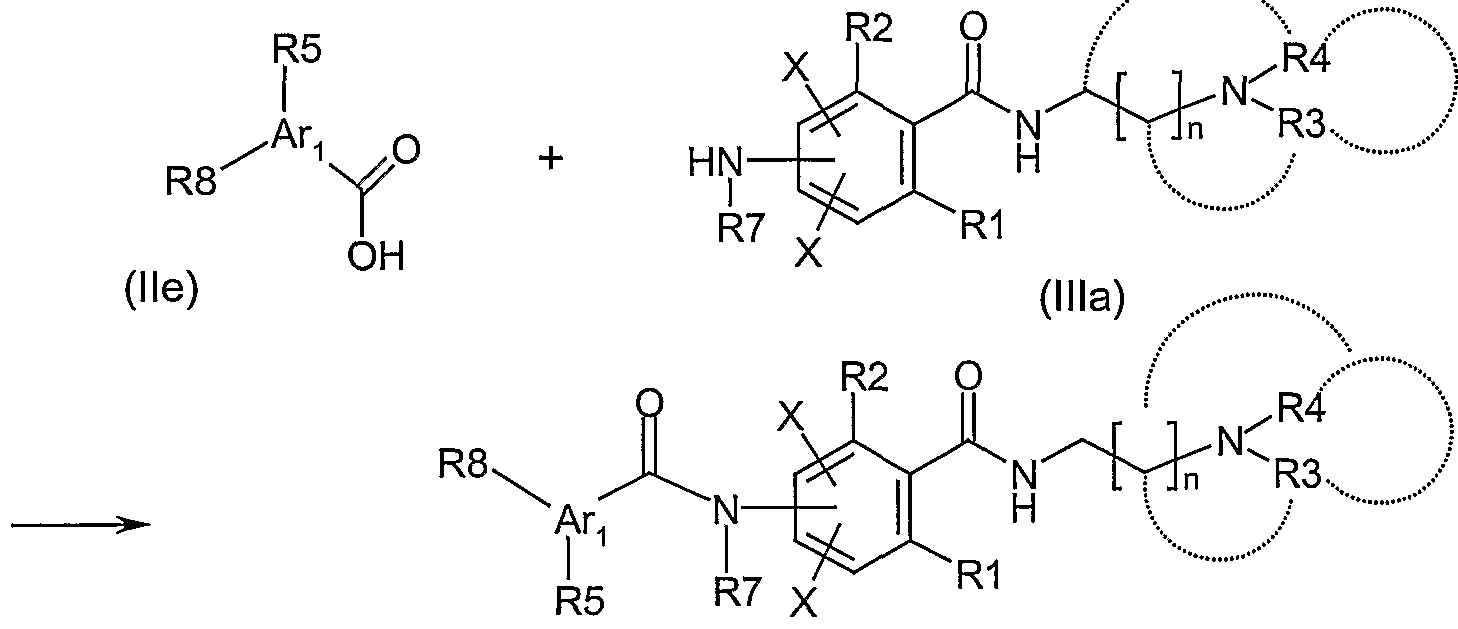 Thus, the benzamide bond is formed by reacting a suitably activated carboxylic acid VI (e.g. acid chloride) with the corresponding amines VII in the presence of a base or using suitable coupling reagents such as DCC in presence of promoting agents and a suitable base.