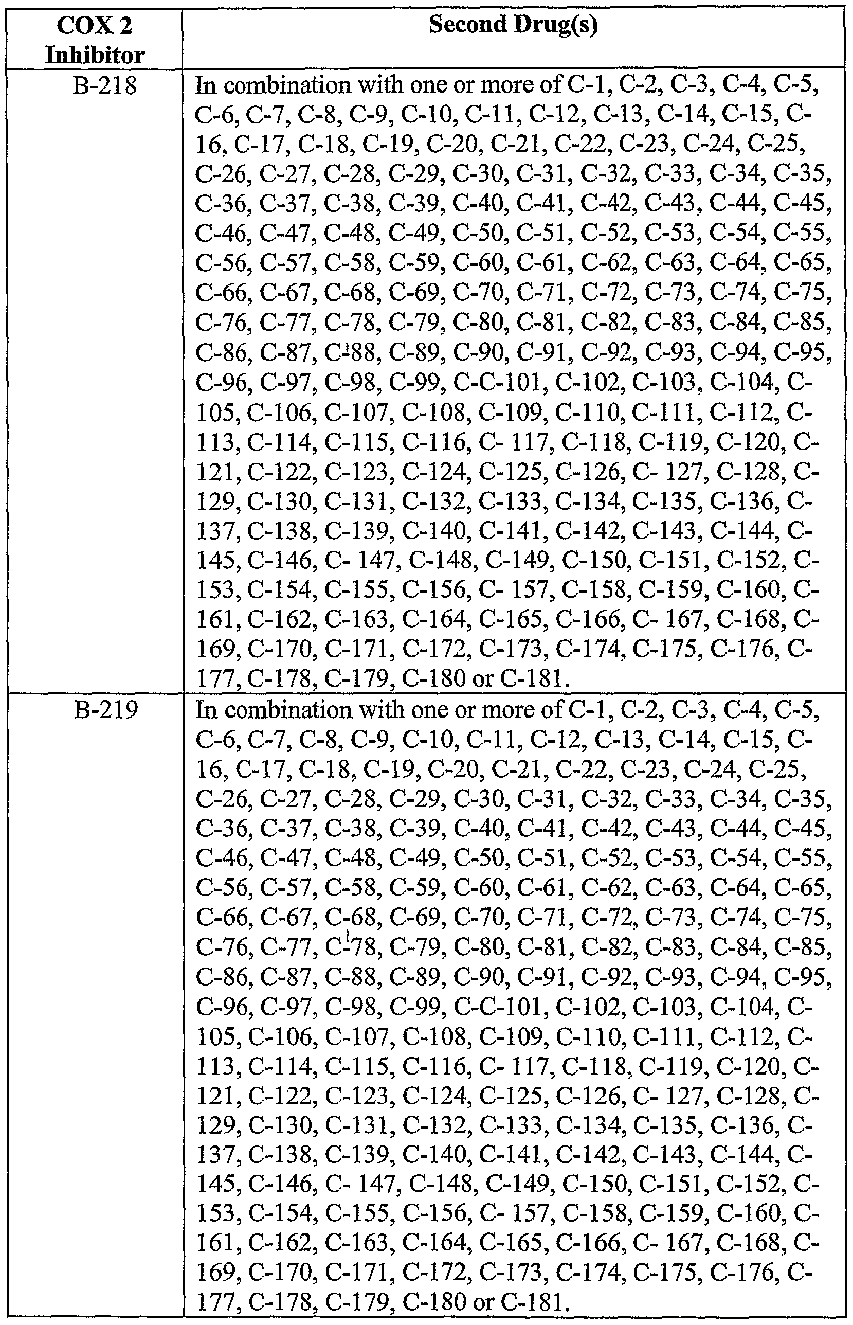 According to an embodiment of the present invention, second drugs (see Table 2) are administered in combination with the COX 2 inhibitors of Tables 1 and 1 A. Also see Tables 2A-2B below. Examples of second drugs within the categories described herein include, but are not limited to, those given in Table 2 below: