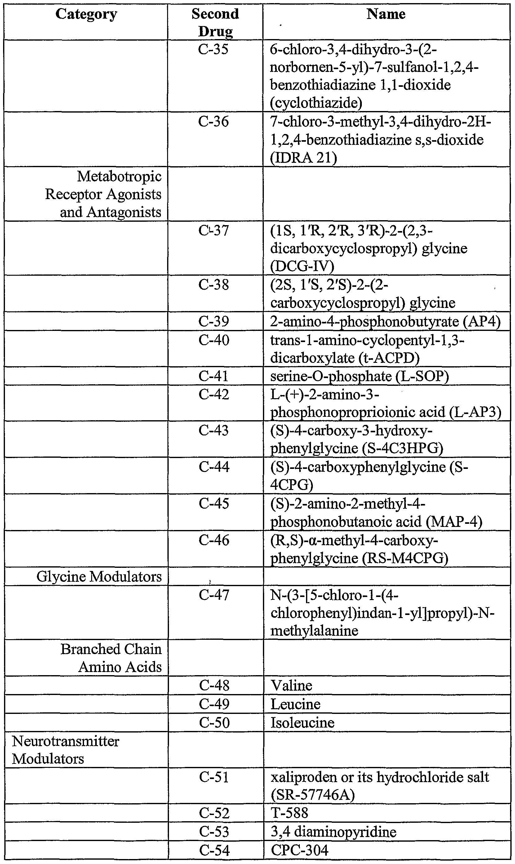 In describing the various categories set forth in Table 2, glutamate antagonists generally reduce the amount of glutamate in the brain by inhibiting