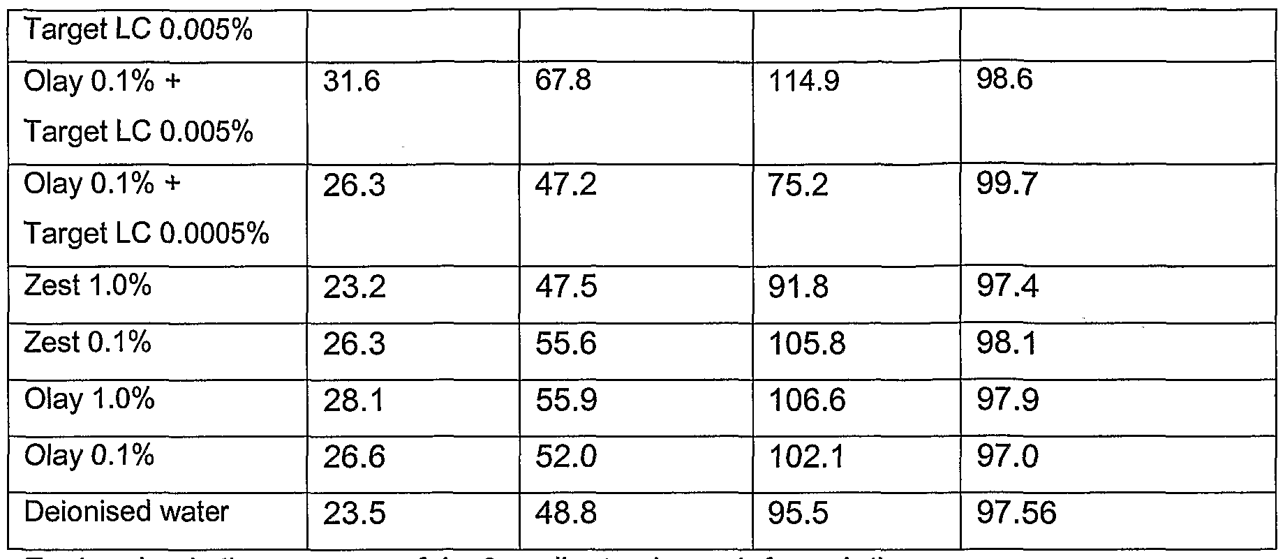 - the invention relates to a shower gel comprising a high molecular weight polymer wherein said polymer has a molecular weight from about 0.8 x 10 6 to 4.0 x 10 7 and comprises from about 0.0001% to about 10% of the shower gel; a protease comprising about 0.0001% to about 10% of the shower gel; and one or more further personal care product ingredients wherein said shower gel has a Dv 50 that is 10 - 200% greater than a corresponding shower gel lacking the high molecular weight polymer.