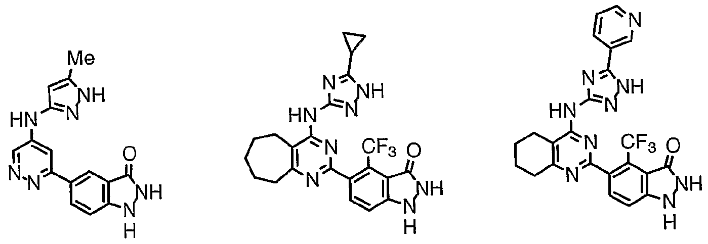 [00488] An assay stock buffer solution was prepared containing all of the reagents listed above with the exception of ATP and the test compound of interest. The assay stock buffer solution (175 μl) was incubated in a 96 well plate with 5 μl of the test compound of interest at final concentrations spanning 0.002 μM to 30 μM at 30°C for 10 min. Typically, a 12 point titration was conducted by preparing serial dilutions (from 10 mM compound stocks) with DMSO of the test compounds in daughter plates. The reaction was initiated by the addition of 20 μl of ATP (final concentration 20 μM). Rates of reaction were obtained using a Molecular Devices Spectramax plate reader (Sunnyvale, CA) over 10 min at 30°C. The Ki values were determined from the rate data as a function of inhibitor concentration. [00489] Compounds of the invention were found to inhibit GSK-3. In certain embodiments, compounds were shown to have Ki values less than 0.1 μM for GSK-3. [00490] Example 2: K, Determination for the Inhibition of Aurora-2 [00491] Compounds were screened in the following manner for their ability to inhibit Aurora-2 using a standard coupled enzyme assay (Fox et al (1998) Protein Sci 1, 2249). [00492] To an assay stock buffer solution containing 0.1M HEPES 7.5, 10 mM MgCl2, 1 mM DTT, 25 mM NaCl, 2.5 mM phosphoenolpyruvate, 300 mM NADH, 30 mg/ml pyruvate kinase, 10 mg/ml lactate dehydrogenase, 40 mM ATP, and 800 μM peptide (American Peptide, Sunnyvale, CA) was added a DMSO solution of a compound of the present invention to a final concentration of 30 μM. The resulting mixture was incubated at 30 °C for 10 min. The reaction was initiated by the addition of 10 μL of Aurora-2 stock solution to give a final concentration of 70 nM in the assay. The rates of reaction were obtained by