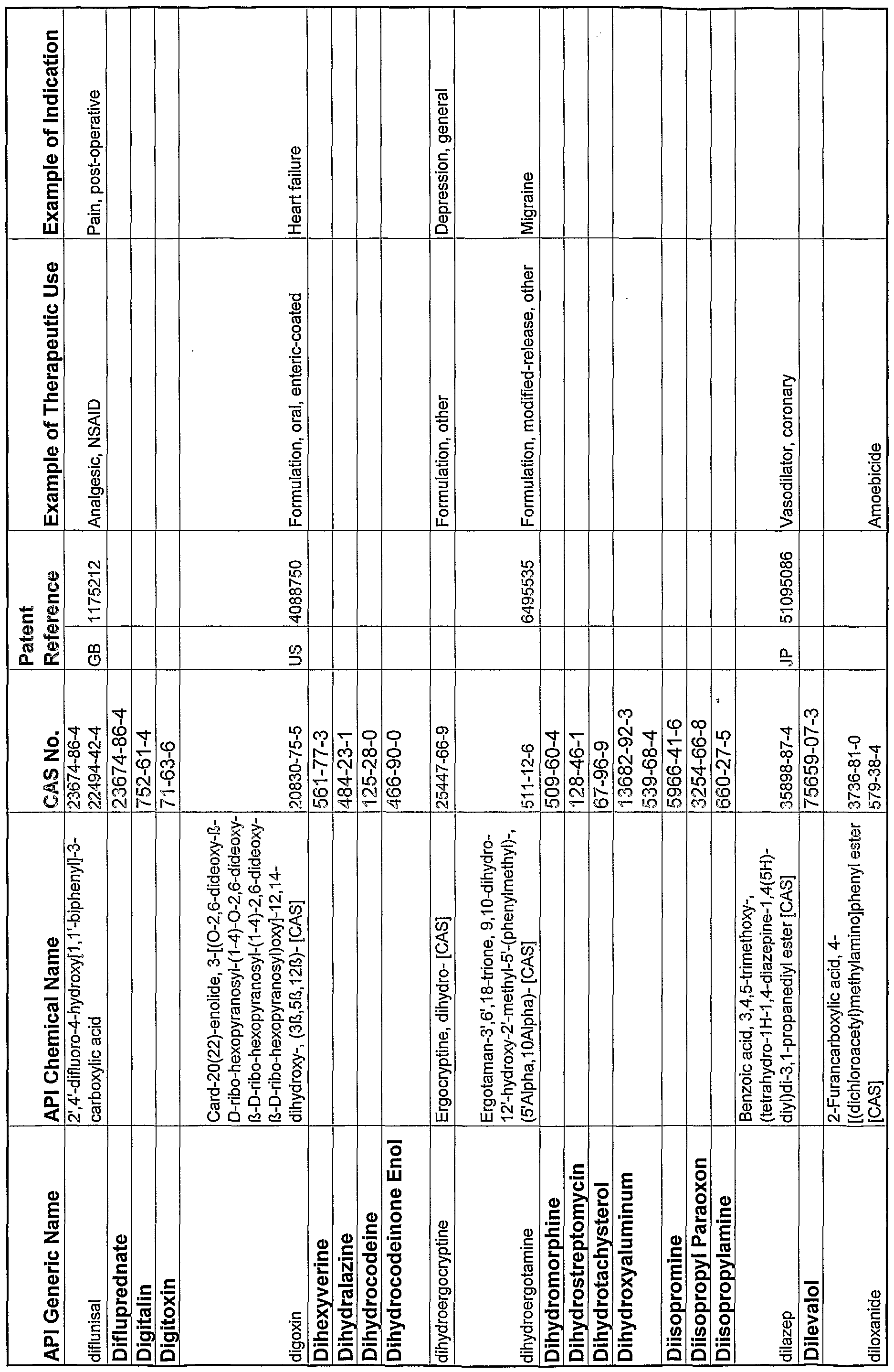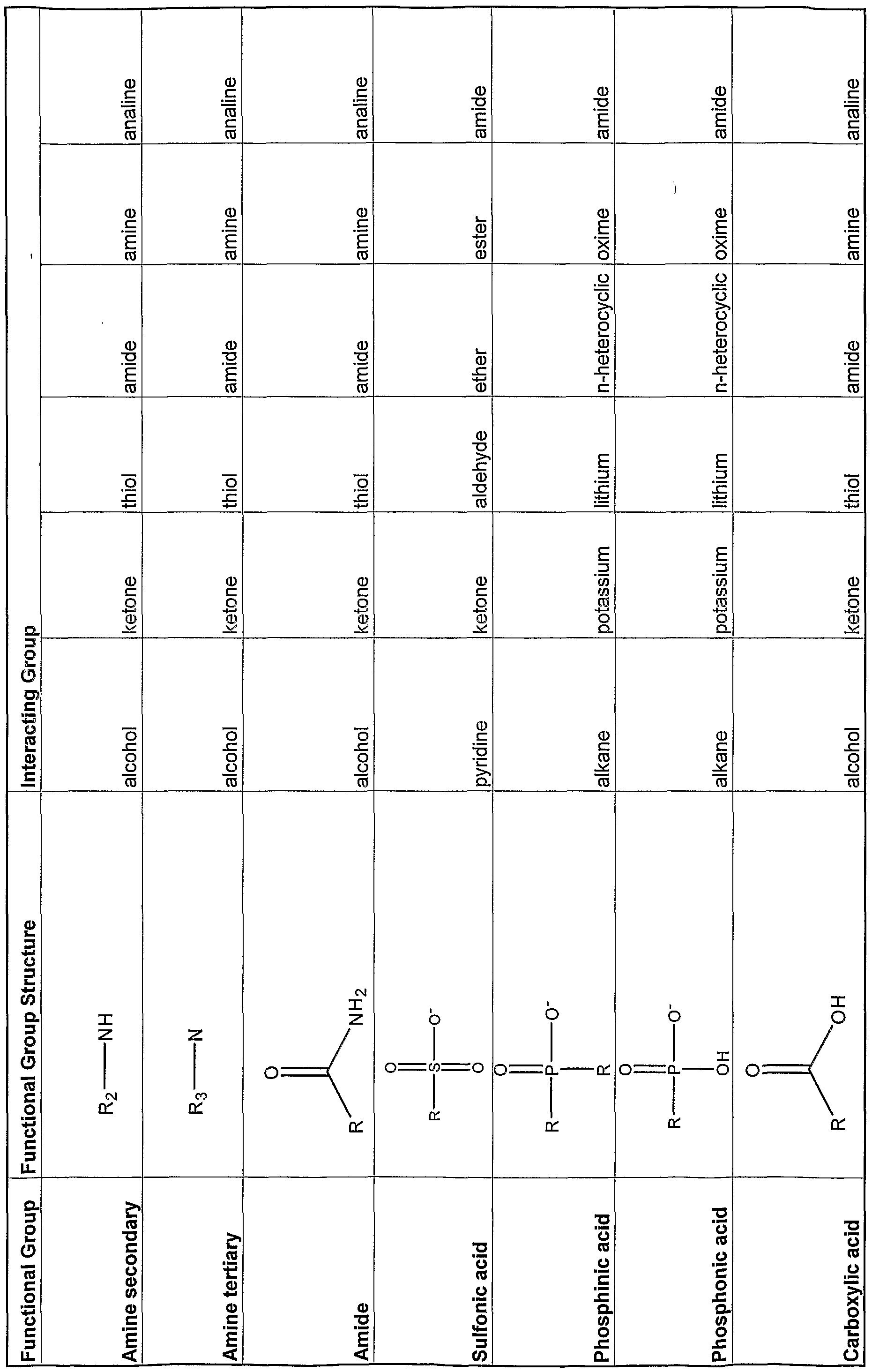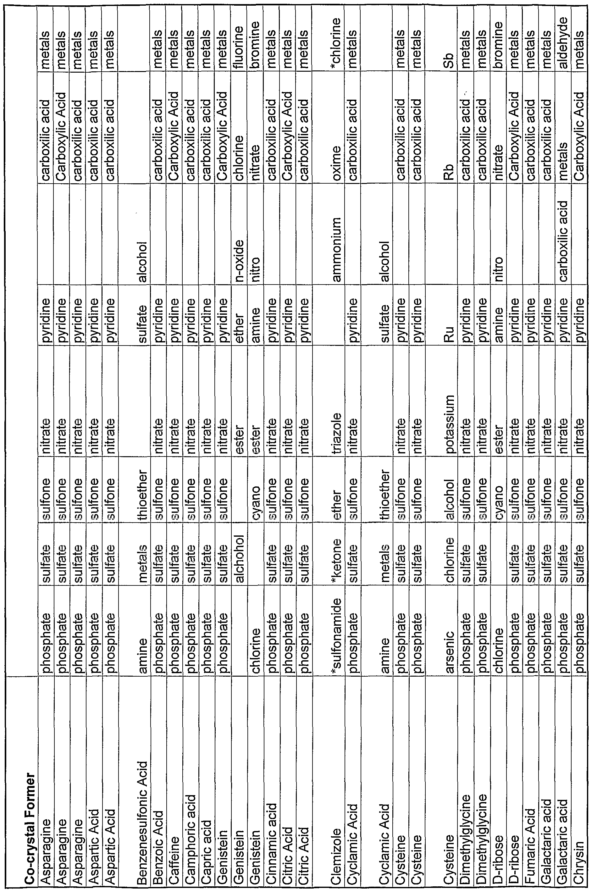 In another embodiment the particular functional group of a co-crystal former interacting with the API is specified (see for example Table I, columns labeled "Functionality" and "Molecular Structure" and the column of Table II labeled "Co- Crystal Former Functional Group"). In a further embodiment the functional group of the API interacting with the co-crystal former functional group is specified (see, for example, Tables II and III).