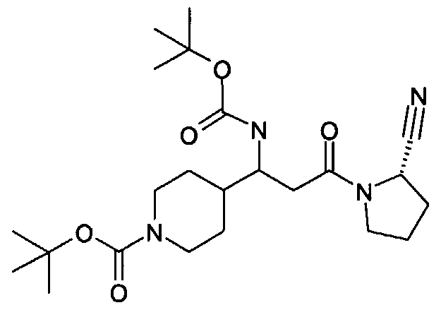 2-[2-(4-Nitrophenyl)vinyl]-4-oxoazetidine-1-carboxylic acid tert-butyl ester was reacted and purified as described in example 54 step D to give 0.042 g of compound 62C as a crude "product". The expected product: [1-[2-(2-(S)-Cyanopyrrolidin-1-yl)-2-oxoethyl]-3-(4- nitrophenyl)allyl]carbamic acid tert-butyl ester was not detected, but further analysis in the next reaction step showed that surprisingly the cyanide anion group had added onto the double bond to give compound 62C.