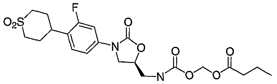 - Examples of the present invention are: (1) ( ⁇ [acetyl( ⁇ (5R)-3-[4-(l,l-dioxidotetrahydro-2H-thiopyran4-yl)-3- fluorophenyl]-2-oxo-l,3oxazolidin-5-yl ⁇ -methyl)amino] carbonyl ⁇ oxy)methylacetate, (2) (R)- propionic acid (acetyl- ⁇ 3-[4-(l,l-dioxo-hexahydro-l ⁇ 6 -thiopyran-4-yl)-3- fluoro-phenyl] -2-oxo-oxazolidin-5-ylmethyl ⁇ -carbamoyloxy)-methyl ester,