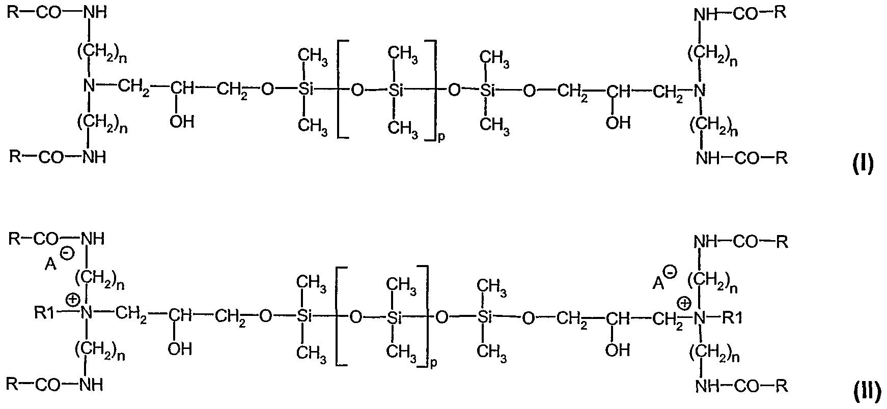 - a " is CH 3 OSO 3 " , chloride, bromide, iodide or tosylsulfate, preferably CH 3 OSO 3 " or chloride, n is 2 or 3, p is 10-200, preferably 20-50, q+z is 10-400, preferably 15-200, and q/z is 5-50, preferably 10-30.