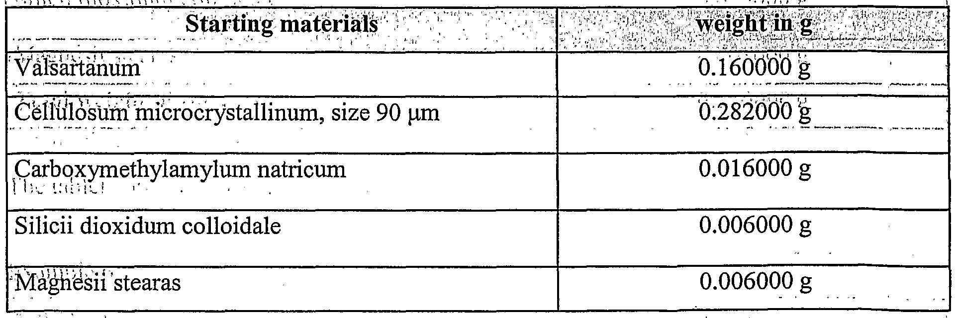 - Patent application WO 9749394 points out the fact that it is possible to produce 300-mg tablets containing 160 mg valsartan by compacting as a surprising possibility. However, it would be a remarkably greater success if such a tablet could be produced without using any granulation.