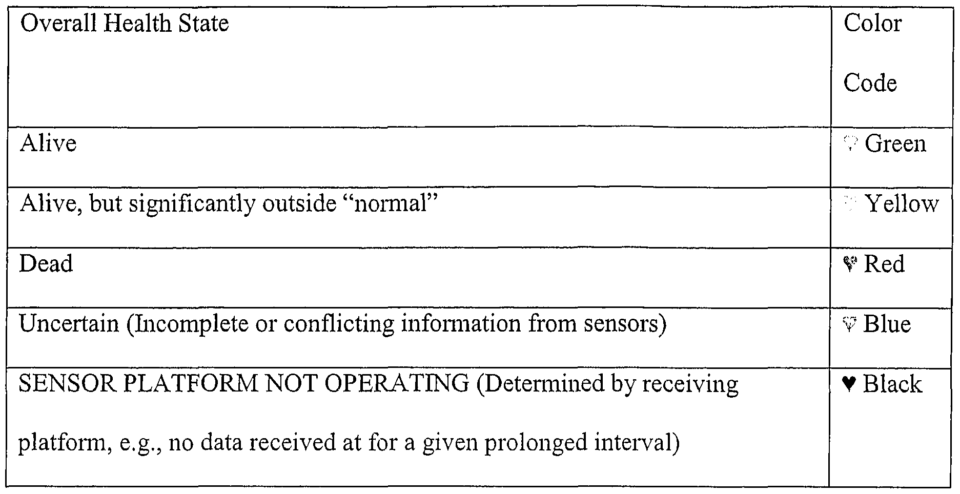 Health State Classifications Table 2 defines the default health state classifications (e.g. alive, abnormal, dead, uncertain) and associates them with a color code that will be available to remote or on- site clinicians. That is, the color code will be displayed at remote assessment stations and on portable clinician input/display devices (such as PDAs).