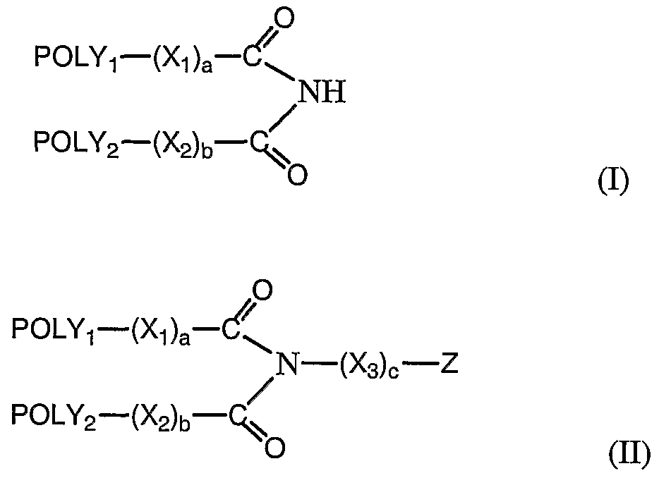 [0090] In one approach for providing the polymers of the invention, the two polymer segments are linked to the imide group prior to attachment of a reactive group to the linking nitrogen atom. In this embodiment, the method comprises the steps of (i) providing a first water-soluble polymer segment carrying a first reactive group that comprises a carbonyl group (C=O), (ii) reacting the first water-soluble polymer segment with anhydrous ammonia to form a water-soluble polymer intermediate carrying a terminal -C(O)-NH2 group, (iii) treating the water-soluble polymer intermediate with a strong base to remove a proton from the terminal -C(O)-NH2 group, (iv) reacting the water-soluble polymer intermediate with a second water-soluble polymer segment carrying a second reactive group comprising a carbonyl group to form a water-soluble polymer of the invention. As previously stated, the water-soluble polymer of the invention comprises (i) an imide group comprising a linking nitrogen atom, a first carbonyl group covalently attached to the linking nitrogen atom, and a second carbonyl group covalently attached to the linking nitrogen atom; (ii) a first water-soluble polymer segment covalently attached, either directly or through one or more atoms, to the first carbonyl group of the imide group; and (iii) a second water-soluble polymer segment covalently