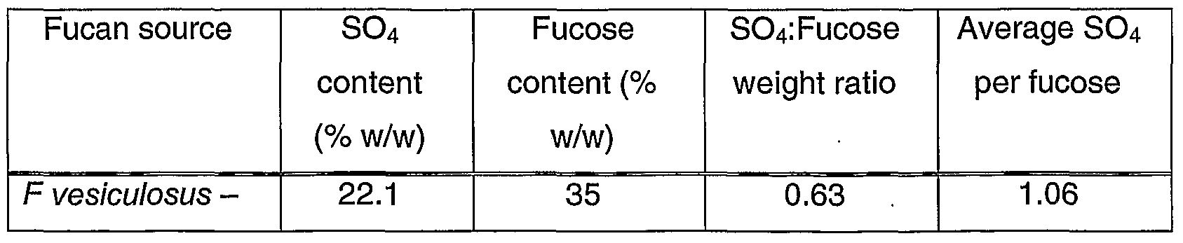 Using a molecular weight for sulphate (SO4) as 97.1 g/mole and a molecular weight of fucose (CβHnOs) of 163.1 g/mole and by measuring the sulphate content, and fucose content of the fucan samples, the ratio of sulphate:fucose could be used to calculate the average number of sulphate groups per fucose monomer. This was done for three sources of fucoidan and the following values were obtained: