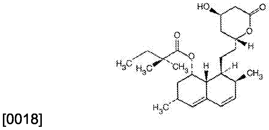 [0023] Simvastatin undergoes extensive first-pass extraction in the liver, its primary site of action, with subsequent excretion of drug equivalents in the bile. As a consequence of extensive hepatic extraction of simvastatin (estimated to be > 60% in man), the availability of drug to the general circulation is low. [0024] US 4,444,784 discloses simvastatin and the production thereof. [0025] WO 03/013608 describes semi-solid pharmaceutical compositions containing a fibrate and a statin prepared by melting the inactive substances,
