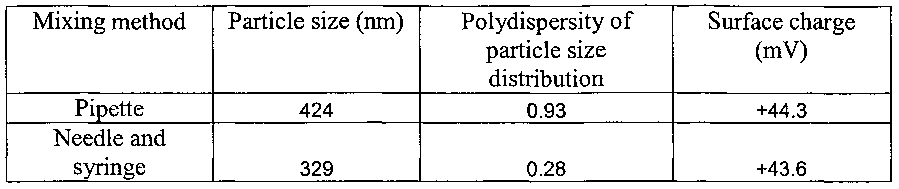 [0278] 403 μl of 6.2 mg/ml plasmid was placed into a 2ml glass vial at room temperature and 597 μl of the 37 0C homogenized CRL-1005 + BAK Ci8 solution was added using a 1 ml pipette, the vial was sealed with a rubber stopper and mixed my inversion 5 times. The size of the particles produced was determined using photon correlation spectroscopy and the surface charge of the particles was also determined using micro-electrophoresis. See Table 39.