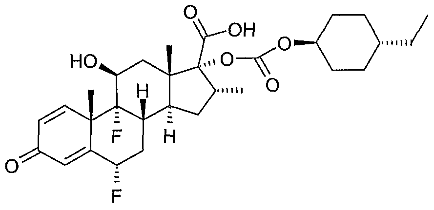 - Cyanomethyl (6 ⁇ , 11 ⁇ , 16 ⁇ , 17 ⁇ )-17-( ⁇ [(c/s-4-ethylcyclohexyl)oxy]carbonyl ⁇ oxy)-6,9- difluoro-11 -hydroxy-16-methyl-3-oxoandrosta-1 ,4-diene-17-carboxylate; ' Cyanomethyl (6 ⁇ , 11 ⁇ ,16 ⁇ , 17 ⁇ )-6,9-difluoro-11 -hydroxy-16-methyl-3-oxo-17-( ⁇ [(1 - propylbutyl)oxy]carbonyl ⁇ oxy)androsta-1 ,4-diene-17-carboxylate; Cyanomethyl (6 ⁇ , 11 ⁇ ,16 ⁇ ,17 ⁇ )-6, 9-difluoro-11 -hydroxy-16-methyl-3-oxo-17-