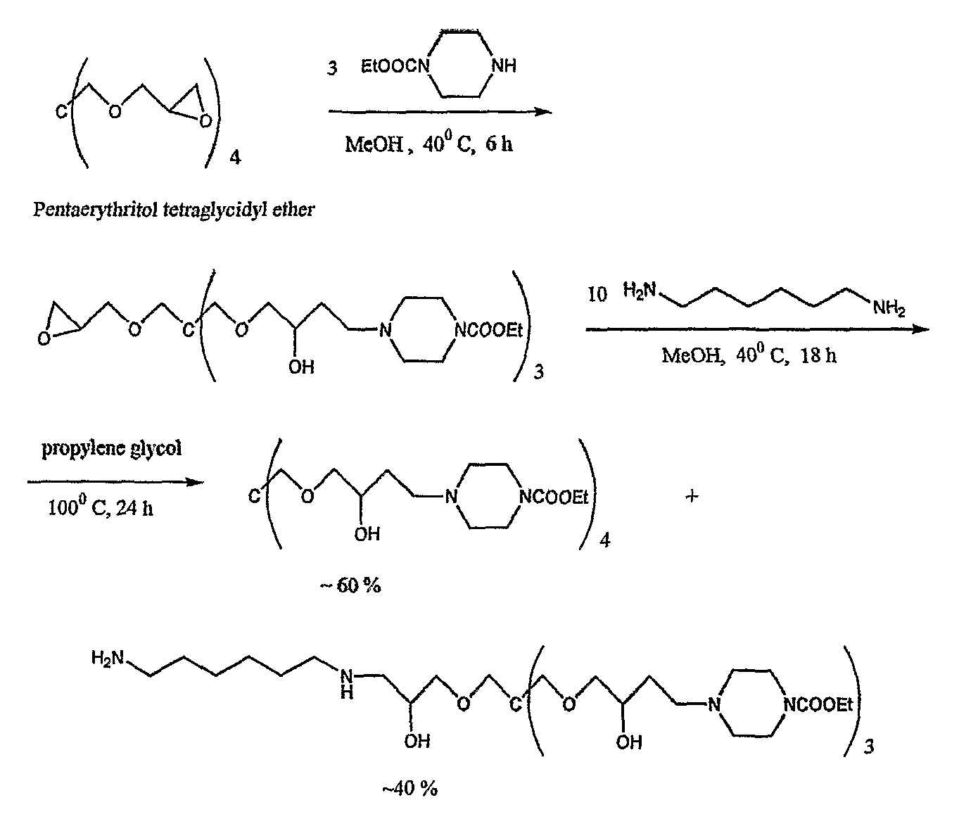 - Such extenders are lysine, poly(amino acids) such a polylysine, linear PEI, poly(N-aryl/aryl)polyethyleneimine oligoethyleneglycols, diethylenetetraamine and higher amine analogs, fatty acids with di- or greater heterogeneous or homogeneous functionality, unsaturated aliphatic and aromatic difunctional or polyfunctional moieties and heterogeneous unsaturated aliphatic and aromatic difunctional or polyfunctional moieties; preferred are diaminoalkanes, diphenols, dithiophenols, aromatic poly(carboxylic acids), mercaptoamines, mercaptoethanol, allylamines, p ⁇ perazine, amino ethyl piperazine, ethyl-N-piperazine carboxylate, allyl glycidyl ethers, ethylenediamine, diethylaminodiacetate, pentaethylenehexamine, aza[2.2.2]cryptand, and branched