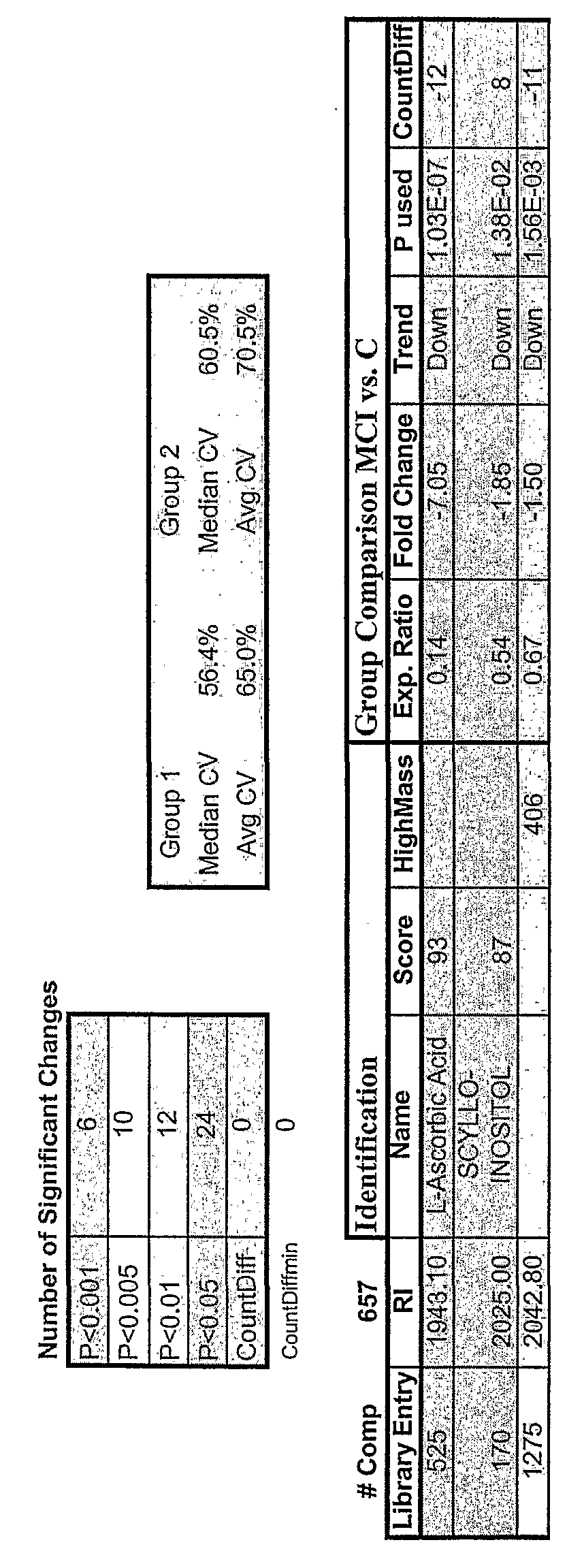 - Another aspect of the invention provides non-peptide small molecules that have been identified as differentially expressed in samples obtained from AD and/or MCI subjects as compared to samples obtained from control subjects, e.g., non-AD and/or non-MCI subjects ("metabolite markers").