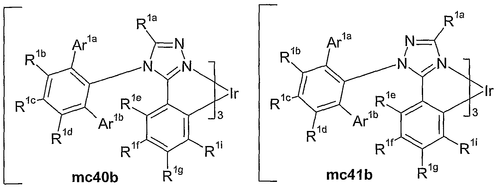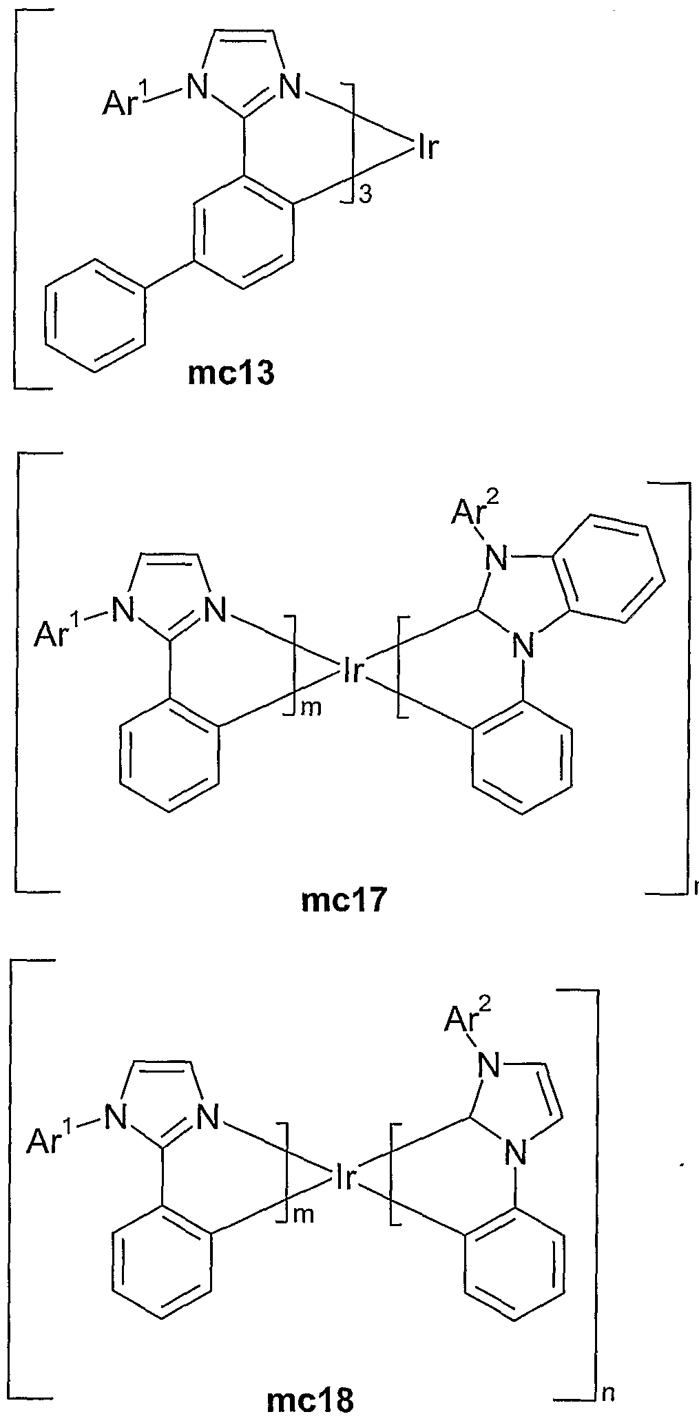 [0294] A 1-neck 50 mL round bottom flask was charged with iV-(2,6-dimethyl-4- bromobenzene)-2-phenylimidazole (3.0 g, 9.2 mmol) and tris(acetylacetonate)iridium(III) (1.12 g, 2.3 mmol). The reaction mixture was stirred under a light nitrogen purge and heated at 200 °C for 48 hours. After cooling, the solidified mixture was dissolved with methylene chloride and purified by silica gel (treated with triethylamine) chromatography using 20% dichloromethane/hexanes as eluent. The good fractions were combined and the solvent removed by rotary evaporation. The product was then recrystallized from dichloromethane/methanol and filtered yielding 0.17 grams of fac mc49i-l.