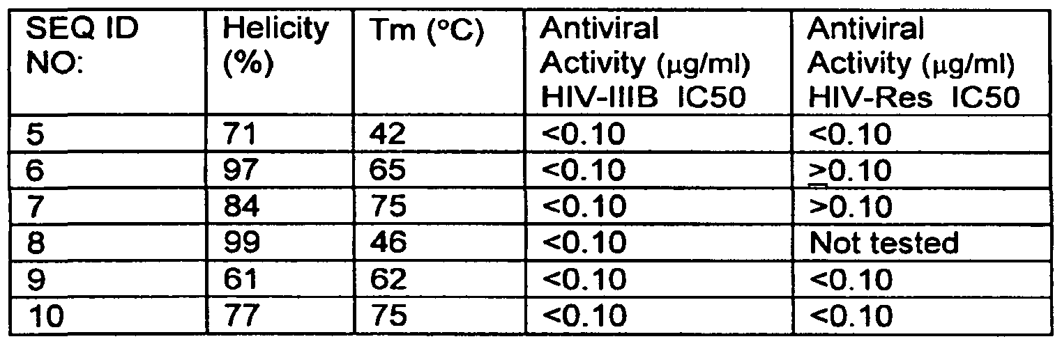 acid difference, a leucine in amino acid position 21 (whereas SEQ ID NO:6 has an isoleucine in amino acid position 21). With reference to Table 1, the leucine for isoleucine substitution in SEQ ID NO:9 delivers a reduction (from 97% to 61%) in helicity, while maintaining antiviral activity, including a good resistance profile (activity against the resistant viral isolate "Res") as compared to a peptide of SEQ ID NO:6. Similarly, SEQ ID NO:7 is an amino acid sequence similar to an HIV fusion inhibitor peptide according to the present invention having SEQ ID NO:10, except that the amino acid sequence of SEQ ID NO: 10 has one amino acid difference, a leucine in amino acid position 21 (whereas SEQ ID NO:7 has an isoleucine in amino acid position 21). With reference to Table 1, the leucine for isoleucine substitution in SEQ ID NO: 10 results in a reduction (from 84% to 77%) in helicity, while maintaining antiviral activity, including a good resistance profile (activity against the resistant viral isolate "Res") as compared to a peptide of SEQ ID NO:7. Thus, Table 1 demonstrates improved properties for SEQ ID NO:9 and 10 relative to SEQ ID NOS:6-7.