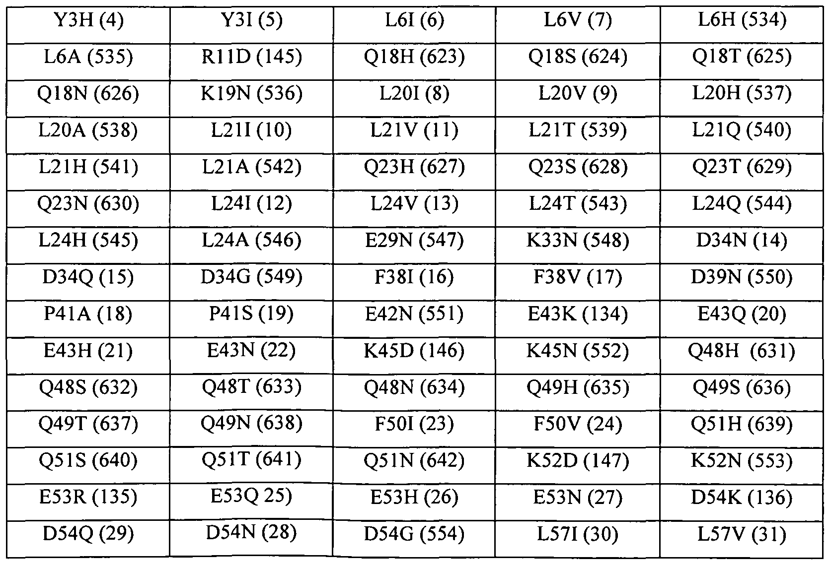 - Exemplary amino acid modifications correspond to any of Y3I, Q18S, Q18N, K19N, L20I, L20V, K33N, D34N, P41A, P41S, E42N, E43N, K45D, K45N, Q48S, Q48T, Q49H, Q49S, Q49T, F50I, F50V, Q51H, Q51S, Q51T, Q51N, K52D, K52N, E53N, D54K, D54N, D54G, L57I, Y60I, E61K, E61H, E61N, L63I, Q64H, Q64S, Q64T, F70I, F70V, Q72H, Q72S, E85N, L88I, L88V, L98I, L98V, K99N, E103N, E104N, K105D, K105N, L106I, L106V, E107N, E109N, K115D, K115N, K115S