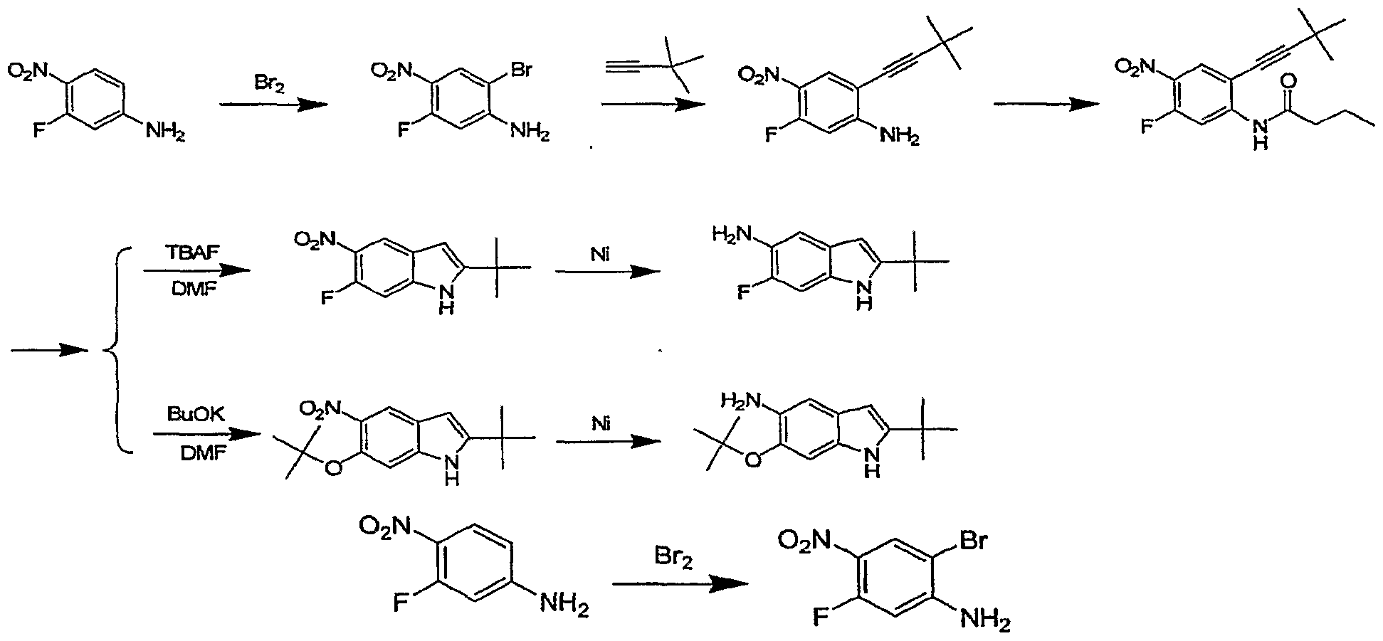 [001008] 4-tert-Butyl-5-nitro-2-trimethyIsilanylethynyl-phenylamine [001009] To a mixture of 2-bromo-4-ferJ-butyl-5-nitro-phenylamine (27.3 g, 100 mmol) in toluene (200 mL) and water (100 mL) was added Et3N (27.9 mL, 200 mmol), Pd(PPh3)2Cl2 (2.11 g, 3.00 mmol), CuI (950 mg, 0.500 mmol) and trimethylsilyl acetylene (21.2 mL, 150 mmol) under a nitrogen atmosphere. The reaction mixture was heated at 70 0C in a sealed pressure flask for 2.5 h., cooled down to room temperature and filtered through a short plug