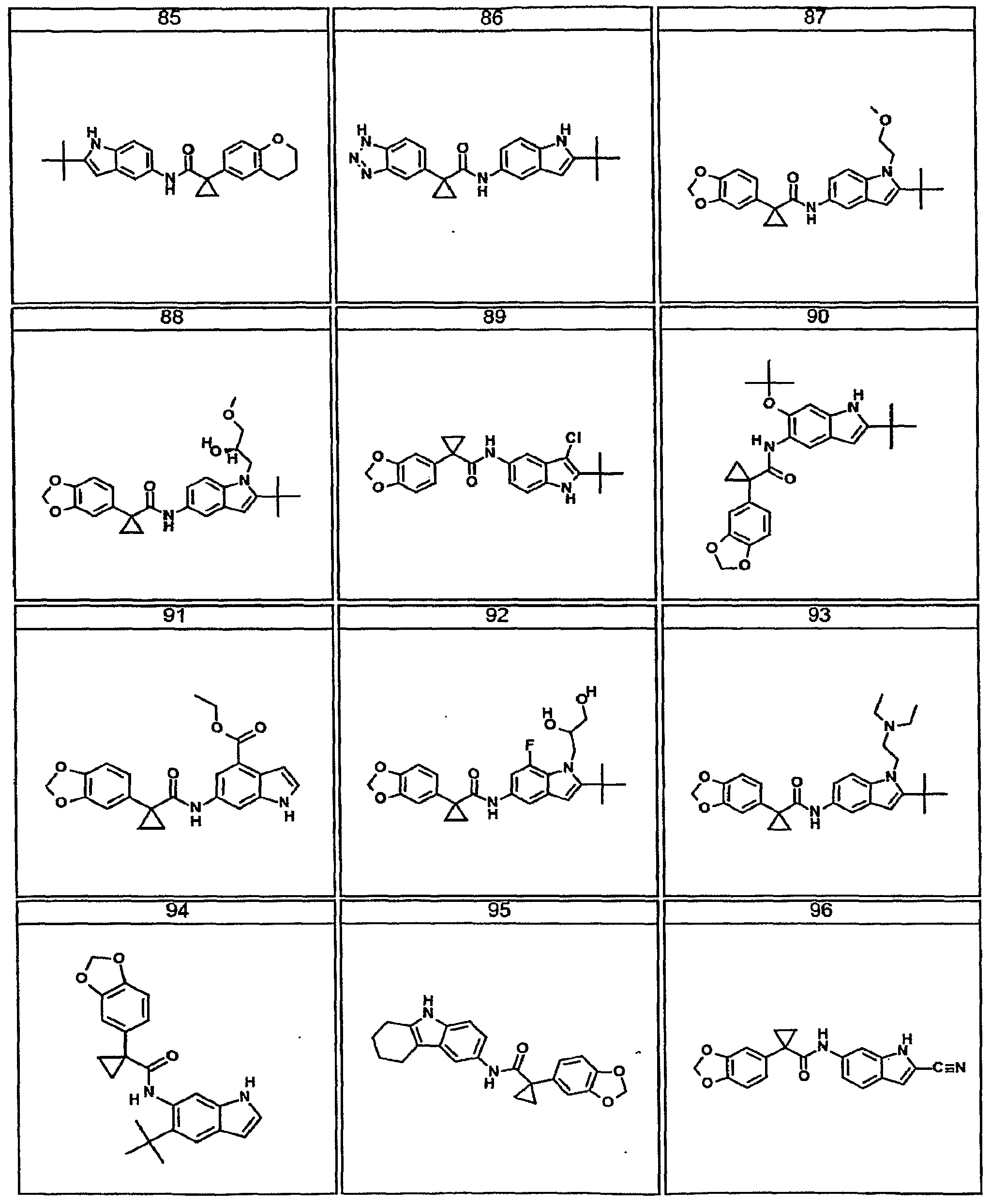 mL).and briefly exposed to daylight. The purple solution was stirred open to the atmosphere at room temperature for 2 h. The solvent was removed under reduced pressure and the residue was treated with Pd-C (10 mg) in MeOH (2 mL) under 1 atm of H2 for 2 h. The catalyst was filtered through Celite and the solvent was removed under reduced pressure. The residue was purified by preparative TLC 30% ethyl acetate/hexanes to provide 1- (benzo[d][l,3]dioxol-5-yl)-Λr-(2-ferr-butyl-6-fluoro-l-(3-hydroxypropyl)-lH-indol-5- yl)cyclopropanecarboxamide (18 mg, 8% from l-(benzo[d][l,3]dioxol-5-yl)-iV:-(2-fert-butyl- 6-fluoroindolin-5-yl)cyclopropane-carboxamide). 1H NMR (400 MHz, CDCl3) δ 8.11 (d, J = 7.8 Hz, IH), 7.31 (d, J = 2.2 Hz, IH), 6.94 (dd, J = 7.9, 1.7 Hz, IH), 6.91 (d, J = 1.6 Hz, IH), 6.85 (d, J = 11.7 Hz, IH), 6.79 (d, J = 7.9 Hz, IH), 6.10 (s, IH), 5.94 (s, 2H), 4.25-4.21 (m, 2H), 3.70 (dd, J = 5.7, 5.7 Hz, 2H), 1.93-1.86 (m, 2H), 1.61 (dd, J = 6.8, 3.7 Hz, 2H), 1.35 (s, 9H), 1.04 (dd, J = 6.8, 3.7 Hz, 2H). MS (ESI) m/e (M+H+) 453.0. [00970] Example 106: iV-(l-(2-Acetamidoethyl)-2-tert-butyl-lH-indol-5-yl)-l- (benzo[d][l,3]-dioxol-5-yl)cyclopropanecarboxamide