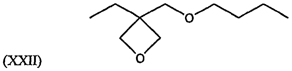 [0119] An amount of 3-bromomethyl-3-methyloxetane (82.5g, 0.5mol) is added to a round bottom flask equipped with mechanical stirring and a condenser. Methylhydroquinone (31.04g, 0.25mol) is added to the flask followed by 25g of water. Tetrabutylammonium bromide (8.0g, 0.025mol) is slowly added to the resulting mixture. Subsequently the mixture is heated to 75°C and potassium hydroxide (35.5g in 50g of water) is added dropwise. The resulting mixture is heated at 800C for 18 hours. The mixture is cooled to room temperature and filtered followed by diluting with water and extraction with methylene chloride. Evaporation of methylene chloride produces 42.1g of crude product that is subsequently