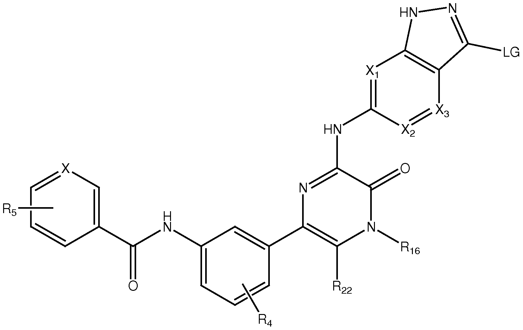 [0048] As used herein, "modulation" refers to a change in kinase activity as a direct or indirect response to the presence of compounds of Formula 1, relative to the activity of the kinase in the absence of the compound. The change may be an increase in activity or a decrease in activity, and may be due to the direct interaction of the compound with the kinase, or due to the interaction of the compound with one or more other factors that in turn affect kinase activity. For example, the presence of the compound may, for example, increase or decrease kinase activity by directly binding to the kinase, by causing (directly or indirectly) another factor to increase or decrease the kinase activity, or by (directly or indirectly) increasing or decreasing the amount of kinase present in the cell or organism.