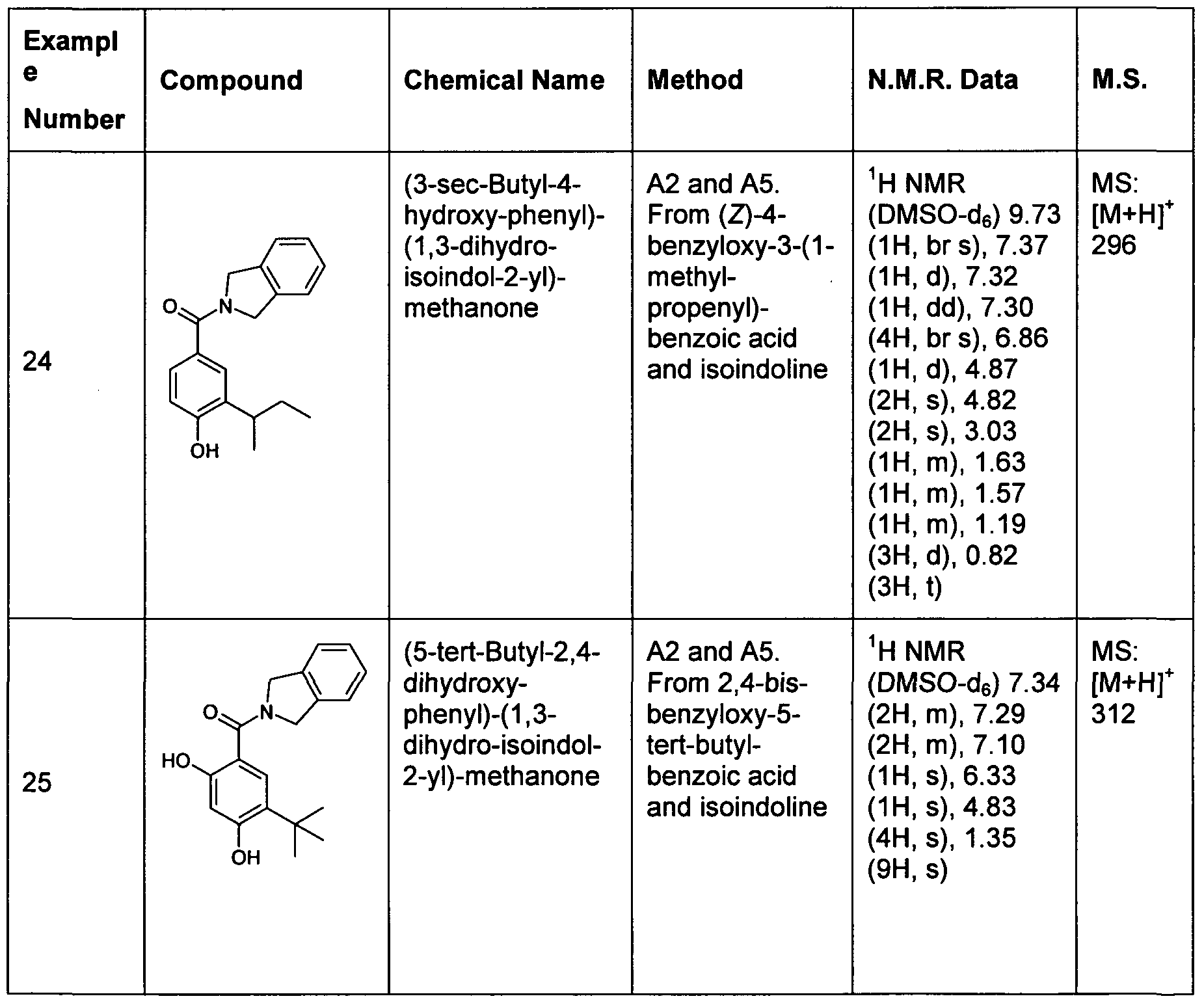 hours. Upon cooling to room temperature the mixture was filtered under gravity, the solids were rinsed with ethanol (2 x 10 ml) and the solvent removed in vacuo to afford (2,3-dihydro-I H-isoindol- 5-yl)-methanol (1.49 g, 100%) as an off-white solid. 1H NMR (DMSOd6) 7.20 (1 H, s), 7.18 (1 H, d), 7.12 (1H1 d), 5.10 (1H, br S)1 4.46 (2H, s), 4.05 (4H1 s). MS: [M+H]+ 150.