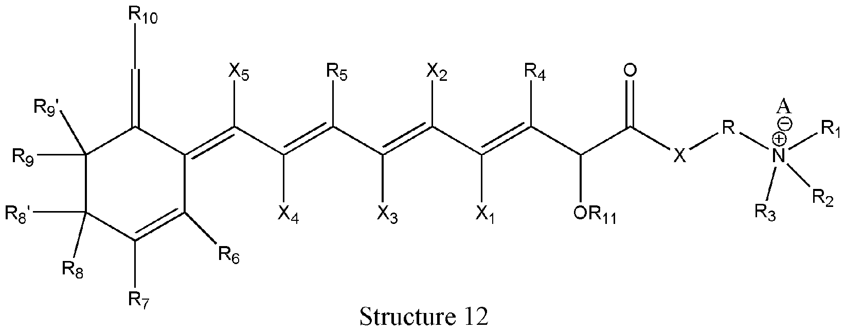 X X , C alkyl, C alkyloxy, C perfluoroalkyl, C alkeny, C alkyny, or C alkyl halide; R5 represents H, OH, Cl, Br, F, I, NO2, CN, SO2X1, COX1, COOX 1, NX 1 COX 2, SOX 1, SX 1, PO 3 X 1 X2, C 1-6 alky -7l, CI-O alky Jloxy -7, CI-O p^er- fluoroalkyl, C alkeny, C alkyny, or C alkyl halide; R represents H, OH, Cl, Br, F, I, NO 2 , CN, SO 2 X 1 , COX 1 , COOX 1 , NX1 COX 2 , SOX 1 , SX1 , PO3 X 1 X2 , C 1-6 alkyl, C alkyloxy, C perfluoroalkyl, C alkeny, C alkyny, or C alkyl halide; R7 represents H, OH, Cl, Br, F, I, NO2, CN, SO2X1, COX1, COOX1, NX1 COX 2, SOX 1, SX 1, PO 3 X 1 X 2, C 1-6 alky -7l, CI-O alky Jloxy -7, CI-O p^erfluoroalky Jl, C 1-6 alkeny, C alkyny, or C alkyl halide; R represents H, OH, Cl, Br, F, I, NO , CN, SO 2 X 1 , COX 1 , COOX 1 , NX1 COX 2 , SOX 1 , SX 1 , PO 3 X 1 X 2 , C 1-6 alkyl, C 1-6 alkyloxy, C perfluoroalkyl, C alkeny, C alkyny, or C alkyl halide; A" represents Cl", Br", F", I", AcO", citrate, or any negative ions. The double bonds on the side chain may have Z or E configuration. All R, R , R , R , R , -(CH ) - groups are branched or straight chains, and may contain C, H, O, S, N, and other atoms and may contain single, double, triple bonds and ring systems.