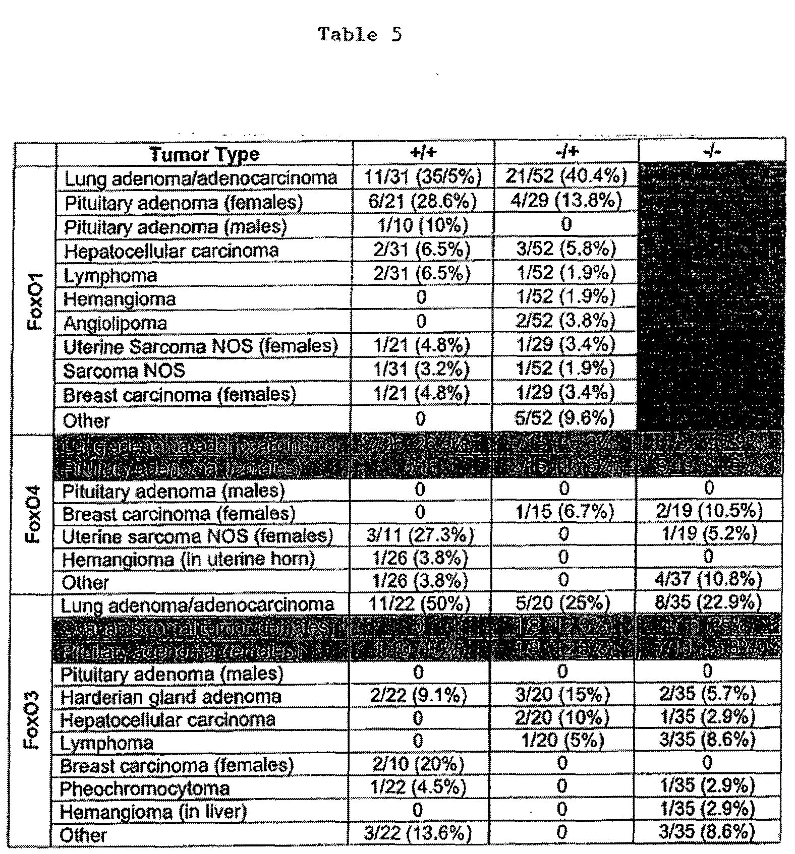- the invention relates to cancer markers (hereinafter “markers” or “markers of the inventions”), which are listed in Tables 1, 2, 3 and 4. These markers were identified as targets of the FoxO transcription factors through a systematic evaluation of FoxO family function performed in vivo.